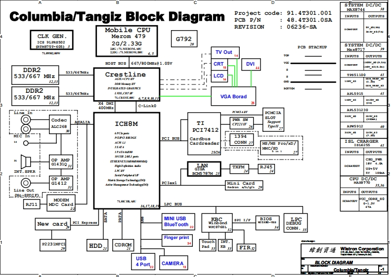 DSYSTEM DC/DCMXB744Columbia/Tangiz Block DiagramProject code:91.4T301.001INMUTSOUTPUrSPCB P/N:48.4T301.0SAMobile CPUREVISION:06236-SAW如W墨行相CLK GEN.Merom 479ICS 9LPR8502G7922G/2.33g29T875T-605】312G:7L.0M.PCB STNCKUPSYSTEM DC/DCMax87173971.0F502.00W23G:71w0M.4.了TV Out0INWUTSOUTPUTSHOST BUS667/e00M组zt1.05VCRTDVIBCTOIDDR244533/667MHx533/667HzCrestlineLCDT951100412.13AGTL CFUVF1_嘘wFDDR27虑正DC成H度S533/667MHxL15,C7AL59154533/667Hz7L.T.&7&9.恩1山VGA Borad231型X4 DMIC-Link05400MHzLine In城IAFAL531230PCMC IA3aw_时CodecPWR SWSLOTICH8MTI221SupportALC26826AW59124PCI74126 PCN portsaaw_鞋9POPO EN DGEPCI BUS1394CardbusACH L.ICardreaderc0N27MS /MS Pro/xD/ISL CHARGERSSATA1S16255T PATA 66400226MMC/SD分INWUTSOUTPUTS042aM.Iw内OP AMPC粉Pa1431Q3划口世是证T/T8T0o0oo.号H轴Dhne14.盘NTXEMRJ45CCLASOOTUP+SVINT.SPKR iLRCV24Srrld Puriphed 18Ba578M2310AOP AMPCPU DC/DCG1412PCIex1Mini CardAH7703a女ea/b/a/a293536Line OutINPUISOUTPIS(NO-EPDIE)MODEM7L.K1&oc_Gol芝g0RJ11⑩C CardJ&7LPC BUS0-11w241AMINI USBKBCs11/rBIOSLPCNewcardBlueTooth25L00-图量DEBUG23NB℃8768134CONN.3SFinger printP2231NFC134TouchCDROM29HDD21PadBFIR罅剑資通Wlstron CorporatlonUSB4 Port22CAMERABLOCK DIAGRAM1