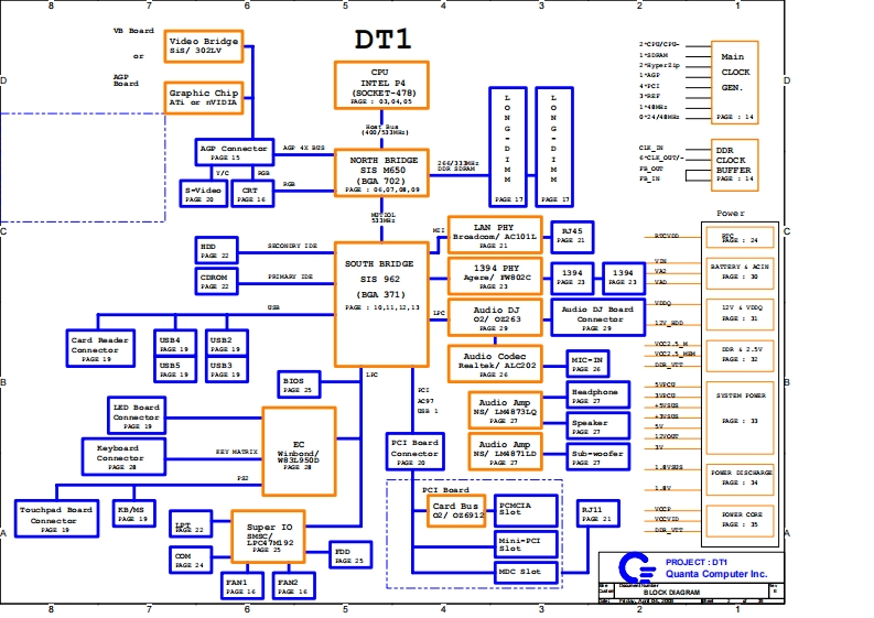 32QUANTA COMPUTERR INC.(March/31/2003)Rev EPAGContentPAG二二二二eo二二二二Cover PagePONER 12V HDD AGP (VDDQ)650 System Block DiagramPONER DDR 2.5VSOCKET 478 1SYSTEM PONER4g0CET478-2POWER DISCHARGE5SOCKET 478-3POWER CORE650-1《Host/AGP)7650-2(Memory for DDR)650-3(Hyperzip/VGA/Misc.)9650-4《Powers)10962-1《ECI/IDE/Hyper 21P)11962-2(Misc.signals)1962-3UgB/1394/IPB)13962-4《P0wex9)14Main Clock Generator BUFFER15AGP SLOTCRT,LCD LID,BLON FAN CONTROLDIMM1 DIMM218DDR TERMINASION9USB,LED/B,PS2,PW RST CONN30PCI CONN PULL UPBLAN PHY (AC101L)RJ45,RJ1122IDE (HDD CDROM)LPT1394(RTL8B01B)HOLE,EMI,RTC COM125SUPER I/O BIOS ROM1415660719296664144426667646460100126126412166171419626AUDIO CODEC(ALC650)27AUDIO AMPLIFIER(LM4873 4871)EC W83L950D29AUD10DJ《0z263)BATTERY CONN PONER JACKPROJECT:DT1Quanta Computer Inc.阳>6542