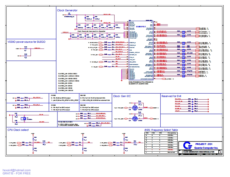 hZO1 SYSTEM BLOCK DIAGRAMClock GeneratorSLG8SP512TMerom CPUCPU479 Pin uFCPGAThermal SensorMXMTVOUTF纪667800MType llPCH-Express1LnIntel NBTFT LCD PanelTVouCrestlineDDRIILVDSDu●hannd DDR2SODIMMOWXGAVGA965GM/965PM533367正SODIMM11299 Pin FBGAU9里5CRTWrNew CardSATA HDDPOE2PCE1Intel SBPCHExpressPATA ODDPATAICH8MNB82801HBMU8日20PCI Bus intertace676 Pin BGAxT山山海透世0USB Port x 440sBroadCom1394+CardreaderGIGA LANControllerBCM5787MCCDInt MICRicoh68 Pin QFNR5C832R5C833PCE3LPCAzalia Audio益兴128 Pin TQFPTransformerAudio AmplifierControllerWinbondRJ45ALC268KBC PC8769LIEEE 13946 in 1 CardreaderFan HeaderPortSocketMIC JackLine inBIOSCIRSpeakerSPDIFMDC 1.5Touch Pad项0JCT:01K/BQuanta Computer Inc.hexainf@hotmal.comGRATIS-FOR FREE
