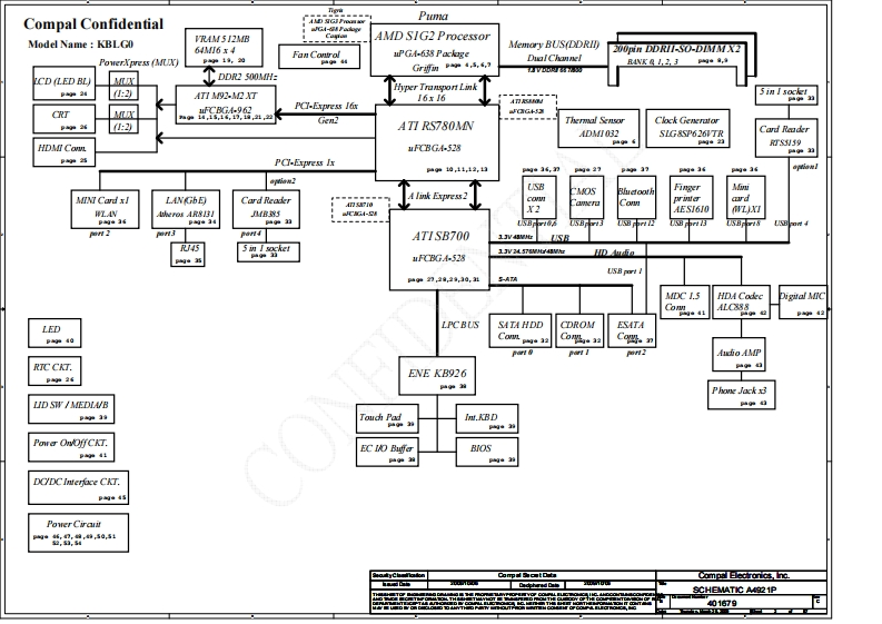 Compal ConfidentialKBLGO/NBLGO Schematics DocumentAMD Puma (JV40-PU):Griffin Processor with RS780MN/SB700/M92-M2 XTTigris(JV40-TR):Caspian Processor with RS880M/SB710/M92-M2 XT2009-03-11REV:1.0Cms旦ectronics,InaSCHEMATIC A4921P401信79