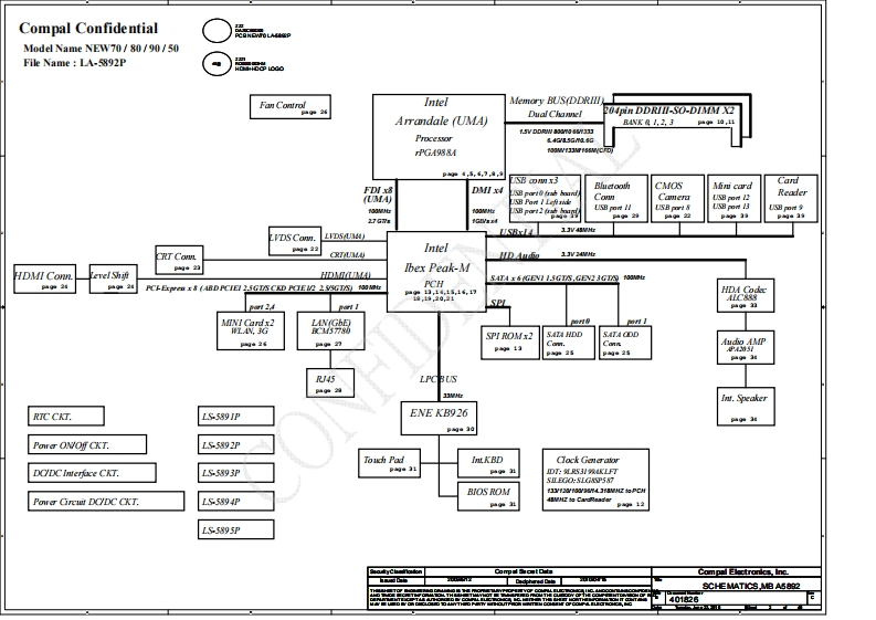 Compal ConfidentialNEW70/80/90/50 M/B Schematics DocumentPEW51 M/B Schematics DocumentIntel Arrandale Processor with DDRIII+Ibex Peak-M2010-06-09REV:1.0Compal Blectonies,Ina.SCHEMATICSMB A5892十401826