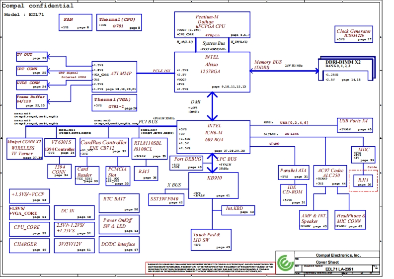 COMPAL CONFIDENTIALMODEL NAME:EDL70/7ICOMPAL P/N:PCB NO:Revision:/BEDL70/71 Schematics DocumentuFCBGA/uFCPGA Mobile DothanIntel Alviso ICH6M2005-02-25REV:1BCompal Electronics,Inc.Cover Sheet8a2侣888罗胎EDL71 LA2351KL1IZT1E