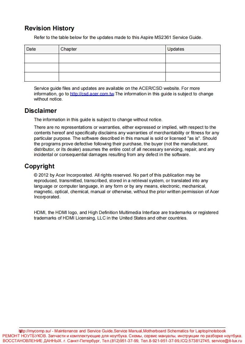 Aspire MS2361SERVICEGUIDEhttp://mycomp.su/-Maintenance and Service Guide,Service Manual,Motherboard Schematics for Laptop/notebookPEMOHT HOyTBYKOB.3anvacT N KOMnnekTyloune An HoyT6yka.CxeMbl,cepBnC MaHyanbl,MHCTpyKUMn no pa36opke HoyT6ykaBOCCTAHOBNEHME AHHbIX.r.CaHKT-neTep6ypr,Ten.(812)951-37-99,Ten.8-921-951-37-99,ICQ:573812745,service@it-lux.ru
