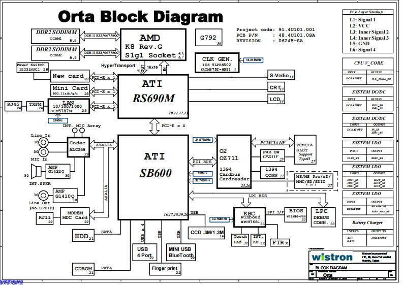 Orta Block DiagramPBL:S式MPL1:Signal 1L2:VCCDDR2 SODIMMProjeet code:91.4U101.001pG家T7677d13:Inner Signal 28,9AMDG792PCB P/N:48.4U101.08AREVISION:06245-8aL4:Inner Signal3L5:GNDDDR2 SODIMMK8 Rev.GL6:Signal 4on2R57667/8,9s1g1SocketCLK GEN.14J18VHEamE号aehHyperTransportIC39LP8502CPU V CORE2231M℃12ERT8751-605)3New cardPCI-E x 1S-Vedio 3DCRAROUTCC.CRE.SATIMini CardCRTis002.114k/ghCI-E xSYSTEM DCDCRS690MLCD:4TCAPITRJ45TXEMLANDCRAROUT2PSo22410/1心671000I-E xCM5787M2310.JI.12.132业SYSTEM DCDCINTM红C ArrayPCI-E x 4FLUEUE●●DCRATOUT品Line InCodec245M▣PCMCIAIEPCMCIASYSTEM LDOALC26802SLOTNMT线TNT29PWR SWMIC InATI0z711CP2边1FSupport25I扣_利如N_PCI BUS27AMPg1432Q13941394SISTEM LDO3030SB600WCardbusC0N27INPOPC0EFOPCardreaderMS/MS Pro/xD/卫了正VINT .SPKR25.28MMC/sD/SDIO27IDSISoAMPSYSTEM LDOG1410QLPC BUSLine Out(No-SPDIF)W AUX ESMODEMUSBKBCsP11/BIOSLPCDCANT OUT版7保924RJ11MDC CardWinbondDEBUG222227壮w876L31a0到c0N.33Ba女ry ChargerSATAHDD21453CCD .3M/1.3MOTFUTS4TouchINT.里A7Pad 32KB 32FIR31USBMINI USB4 Port2BlueToothwistronCDROMPATAF月nger printBLOCK DIAGRAM2122Orta