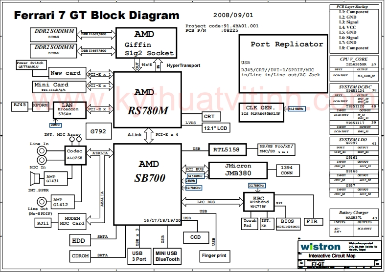 PCB Laver SckopFerrari 7 GT Block Diagram2008/09/01Ll:ComponentL2:GNDL3:SignalProject code:91.4BA01.001L:VCCDDR2 SODIMMPCB P/N:08225DDR165T/60onedAMDL5:GNDL6:SignalDDR2 SODIMMGiffinPort ReplicatorL7 GND18:Componentbne2S1g2 SocketCPU V CORE包166USBG57791UHyperTransport19L6265Hm37New cardRJ45/CRT//DVI-D/SPDIF/MICPCI-E x 1in/Line in/Line out/AC JackDCBAROUTICC COAE SOMini CardPCI-E x 1SYSTEM DCDC002.114k/年hAMDTD95112438atTCAIPIT0DCRAROUTD知RJ45XPORMLAN195112040BroadcomPCI-E x 15764MRS780MCLK GEN.4313Wt.LUUCRTIC8 9LPRS480BKLTFV程2W间LVDST95111712.1"LCDINT.MIC ArrayG792DCBAROUFA-LinkPCI-E x 4●Line InSYSLDO41USBMS /MS Pro/xD/CodecAZALIARTL5158MC/sDsn±o可西W.可Lc268G9161MIC InAMDJMicronPCI BUS1394CONNGc9156AMPg1431SB7002457壮JMB380W.面G9572753世2783也INT .SPKR、2INPOR有◎AMPLPC BUSf醒8adG1412SPILine OutWDC775FUSB(No-SPDIF)Battery ChargerMODEM16/17/18/19/20USBTouch INT.837143RJ11M①C CardBIOSFIRPadBSATACCDHDDdwistronCDROMSATAUSBMINI USB3PortFinger printInteractive Circuit MapBlueToothF7-GT
