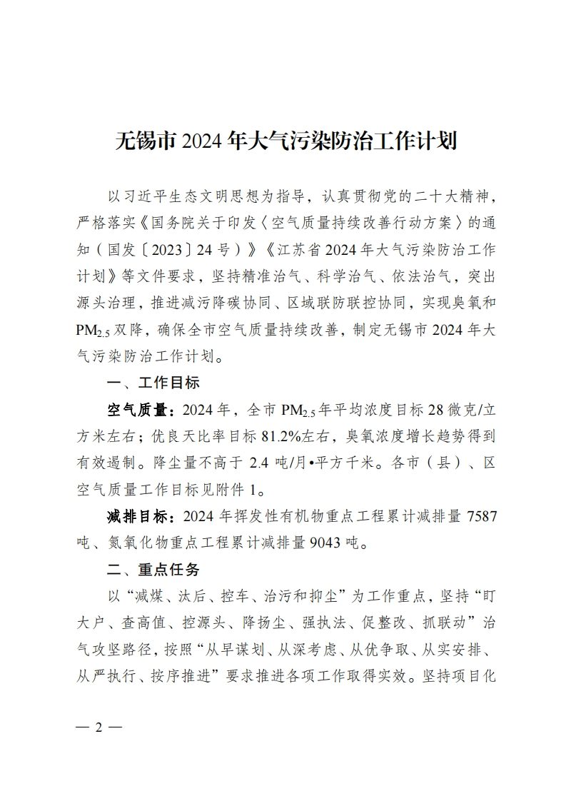 无锡市深人打好污防治被坚战指辉勒公室锡污防攻坚办〔2024」]29号关于印发《无锡市2024年大气污染防治工作计划》的通知各市(县)、区人民政府,无锡经济开发区管委会,市各有关单位:为全面贯彻党的二十大精神,严格落实《国务院关于印发〈空气质量持续改善行动方案〉的通知(国发〔2023〕24号)》《江苏省2024年大气污染防治工作计划》等要求,坚持精准治气、科学治气、依法治气,突出源头治理,推进减污降碳协同、区域联防联控协同,实现臭氧和PM.5双降,确保全市空气质量持续改善,现将《无锡市2024年大气污染防治工作计划》印发给你们,请认真贯彻落实。★无锡市深入打好污尖防迨墨指拌部办公室公2024年月5日(联系人:刘子孺,电话:81823469,电子邮箱:wxwfc@aliyun.com)一1