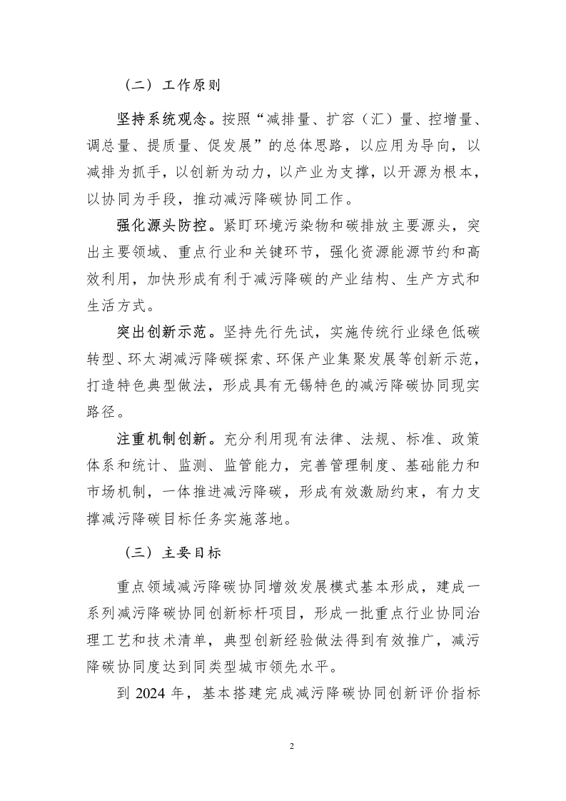 无锡市减污降碳协同创新试点工作方案(征求意见稿)为深入贯彻党中央、国务院关于碳达峰碳中和重大战略决策部署,全面落实生态环境部、国家发展改革委等六部门《减污降碳协同增效实施方案》(环综合〔2022)42号)和《江苏省减污降碳协同增效实施方案》(苏环发〔2023)1号),根据生态环境部《关于印送减污降碳协同创新试点任务清单的函》(综合函(2024)18号)要求,结合我市实际,制定本工作方案。一、总体要求(一)指导思想以习近平新时代中国特色社会主义思想为指导,全面贯彻党的二十大精神,深入贯彻习近平生态文明思想和习近平总书记对江苏工作重要指示精神,认真落实全国生态环境保护大会精神,完整准确全面贯彻新发展理念,坚持把实现减污降碳协同增效作为促进经济社会发展全面绿色转型的总抓手,统筹碳达峰碳中和与生态环境保护相关工作,更加注重源头治理、系统治理、综合治理,加快构建减污降碳一体谋划、一体部署、一体推进、一体考核的制度机制,全面提升生态环境治理体系和治理能力,协同推进降碳、减污、扩绿、增长,为深入打好打赢污染防治攻坚战和奋力建设美丽中国先行区无锡样板做出积极贡献。