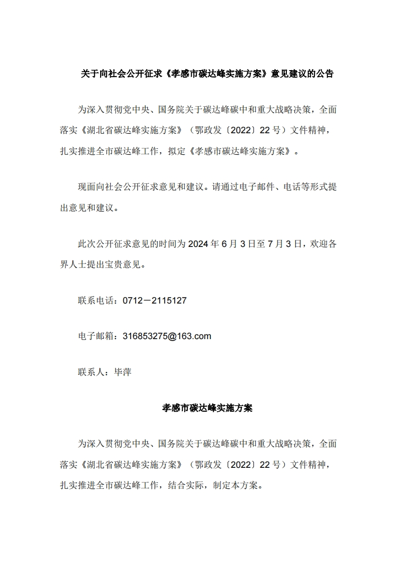 关于向社会公开征求《孝感市碳达峰实施方案》意见建议的公告为深入贯彻党中央、国务院关于碳达峰碳中和重大战略决策,全面落实《湖北省碳达峰实施方案》(鄂政发〔2022)22号)文件精神,扎实推进全市碳达峰工作,拟定《孝感市碳达峰实施方案》。现面向社会公开征求意见和建议。请通过电子邮件、电话等形式提出意见和建议。此次公开征求意见的时间为2024年6月3日至7月3日,欢迎各界人士提出宝贵意见。联系电话:0712-2115127电子邮箱:316853275@163.c0m联系人:毕萍孝感市碳达峰实施方案为深入贯彻党中央、国务院关于碳达峰碳中和重大战略决策,全面落实《湖北省碳达峰实施方案》(鄂政发〔2022)22号)文件精神,扎实推进全市碳达峰工作,结合实际,制定本方案。