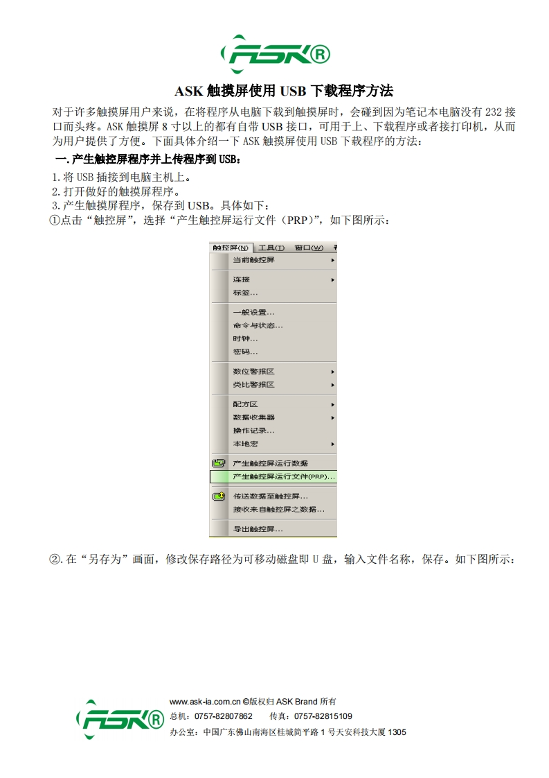 ASK触摸屏使用USB下载程序方法对于许多触摸屏用户来说,在将程序从电脑下载到触摸屏时,会碰到因为笔记本电脑没有232接口而头疼。ASK触摸屏8寸以上的都有自带USB接口,可用于上、下载程序或者接打印机,从而为用户提供了方便。下面具体介绍一下ASK触摸屏使用USB下载程序的方法:一.产生触控屏程序并上传程序到USB:1.将USB插接到电脑主机上。2.打开做好的触摸屏程序。3.产生触摸屏程序,保存到USB。具体如下:①点击“触控屏”,选择“产生触控屏运行文件(PRP)”,如下图所示:控屏(山工具(D窗口(干当前角控屏连接标签.一报设置.命令与状者…时钟.…密码数位答报区类比客报区配方区数据收集器染作记录.…本地宏产生角控屏运行数据产生角控屏运行文件(PRP),,传送数据至控屏.。接收来自控屏之数据.…。导出触控屏,②.在“另存为”画面,修改保存路径为可移动磁盘即U盘,输入文件名称,保存。如下图所示:ww.ask-la.com.cn©版权归ASK Brand所有片示⑧总机:0757-82807862传真:0757-82815109办公室:中国广东佛山南海区桂城简平路1号天安科技大厦1305