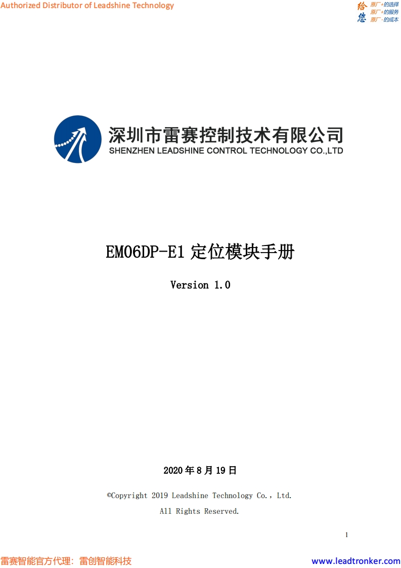 Authorized Distributor of Leadshine Technology拾原厂+的选择原厂+的服务您的成本深圳市雷赛控制技术有限公司SHENZHEN LEADSHINE CONTROL TECHNOLOGY CO.,LTDEM06DP-E1定位模块手册Version 1.02020年8月19日eCopyright 2019 Leadshine Technology Co.,Ltd.All Rights Reserved.雷赛智能官方代理:雷创智能科技www.leadtronker.com