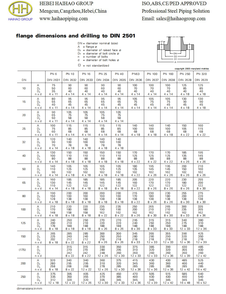 HEBEI HAIHAO GROUPISO.ABS.CE/PED APPROVEDHHMengcun,Cangzhou,Hebei,ChinaProfessional Steel Piping SolutionHAIHAO GROUPwww.haihaopiping.comEmail:sales@haihaogroup.comflange dimensions and drilling to DIN 2501DN=diameter nominal (size)A flange=diameter of raised face oDdiameter of bolt circleDNnumber of bolts⊙1diameter of bolt holes▣not standardizedcopyright 2003 maryl and metricsPN6PN10PN 16PN 25PN 40PN63PN100PN160PN250PN320DNDIN 2631DIN 2632DIN 2633DIN 2634DIN 2635DIN 2636DIN 2637DIN 2638DIN 2628DIN 2629A7590909090100100100125125105060606067070708585035404040404040404040n x d4×114X144×144X144×144×144X144×144X184×18A80951051051051301557575759040454545455454545nx d4X114×144×144×144144×144X144×144X184X18A1051051051052055058585858nx a4X114×144×144×144×141001151111511514014014015016025D75856851001001001051156068686868686868n x d4×114X144×144×144×144×184×184×184X224X22A120140140140329011001001007087878n x d4X144X184×184×184X181301501501501501701701701851954010011011011011012512512513514580888888888888888n x d4X144X184×184×184×184X224X224X224X264X2614016516516518019521050D110125125125135145160D290102102102102102102102102102n x d4X144X184×184×184×184X224X264X268X268X26P16018518518518520522022023025565130145145145145160170170180200110122122122122122122122122122n xd4x144×184×188X188X188X228X268X268X268X3019020020020020021523023025527580150160160160160170180180200220128138138138138138138138138138n x d4X188X188×188×188×188X228X268X268X308X30210250265300100170820021023514R15158162162162162162162162nxa4×188X188×188×228×228X268×308X308X338X36A240250250270270295315315340380125D2002102102202202402502502753101781881881881881881B8188188188n x d8X188188X188X268X268X308X338X3312×3312×36265285300300345355355390425150D22524025025028029029032035020221221221218218218218218n x d8×188X228×228X268×268X3312×3312×3612×39315315330350375385390430485(175]270270280295310320320U355400242242249260260260260260260n x d8X228X2212×2612×3012×3312×3312×3612×3912×423203403403603754154304304R5525200◇280295295310320345360360400440258268268278285285285285285285n x d8×188×2212×2212X2612×3012×3612×3612×3612×4216×42粥425450470505515585640250◇335370385400430430490540312320320335345345345245345345nxa12×1812×2212X2612×3012X3312X3612×3912X4216X4816X52dimensions inmm