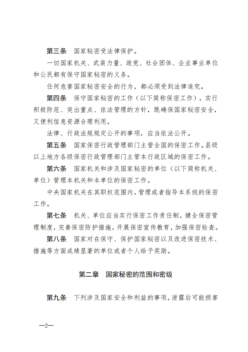 中华人民共和国保守国家秘密法(1988年9月5日第七届全国人民代表大会常务委员会第三次会议通过2010年4月29日第十一届全国人民代表大会常务委员会第十四次会议修订)目录第一章总则第二章国家秘密的范围和密级第三章保密制度第四章监督管理第五章法律责任第六章附则第一章总则第一条为了保守国家秘密,维护国家安全和利益,保障改革开放和社会主义建设事业的顺利进行,制定本法。第二条国家秘密是关系国家安全和利益,依照法定程序确定,在一定时间内只限一定范围的人员知悉的事项。-1