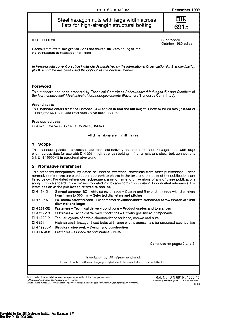 DEUTSCHE NORMDecember 1999Steel hexagon nuts with large width acrossNflats for high-strength structural bolting6915CS21.080.20SupersedesOctober 1989 edition.Sechskantmuttern mit groBen Schlusselweiten fur Verbindungen mitHV-Schrauben in StahlkonstruktionenIn keeping with current practice in standards published by the Intemational Organization for Standardization(ISO),a comma has been used throughout as the decimal marker.ForewordThis standard has been prepared by Technical Committee Schraubenverbindungen for den Stahlbau ofthe NormenausschuB Mechanische Verbindungselemente (Fasteners Standards Committee).AmendmentsThis standard differs from the October 1989 edition in that the nut height is now to be 20 mm(instead of19 mm)for M24 nuts and references have been updated.Previous editionsDN6915:1962-08,1971-01,1979-03,198g-10.All dimensions are in millimetres.1 ScopeThis standard specifies dimensions and technical delivery conditions for steel hexagon nuts with largewidth across flats for use with DIN 6914 high-strength bolting in friction grip and shear bolt connections(cf.DIN 18800-1)in structural steelwork.2 Normative referencesThis standard incorporates,by dated or undated reference,provisions from other publications.Thesenormative references are cited at the appropriate places in the text,and the titles of the publications arelisted below.For dated references,subsequent amendments to or revisions of any of these publicationsapply to this standard only when incorporated in it by amendment or revision.For undated references,thelatest edition of the publication referred to applies.DN13-12General purpose ISO metric screw threads -Coarse and fine pitch threads with diametersfrom 1 mm to 300 mm-Selected diameters and pitchesDiN13-15ISO metric screw threads-Fundamental deviations and tolerances for screw threads of 1 mmdiameter and largerDN267-02Fasteners-Technical delivery conditions -Product grades and tolerancesDN267-10Fasteners-Technical delivery conditions -Hot-dip galvanized componentsD1N4000-2Tabular layouts of article characteristics for bolts,screws and nutsDN6914High-strength hexagon head bolts with large widths across flats for structural steel boltingDIN 18800-1 Structural steelwork-Design and constructionDIN EN 493Fasteners -Surface discontinuities-NutsContinued on pages 2 and 3.Translation by DIN-Sprachendienst.in case of doubt.the German-language orlginal should be consulted as the authorltatlve textNo part of this translation may be reproduced without the prior permission ofRef.No.DlN6915:1999-12DW Deutschss Institut fur Nommung e.V.,Berlin.Salns No 0105Deuth Vertag Gmo//.D-10772 Berin,has the exclusive right of sale for German Standards (DNV-Narmen).04.00Copyright by the DIN Deutsches Institut Fur Normung E Yom1Mar041312082013