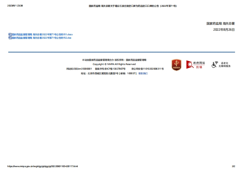 NMPA_关于增设石家庄航空口岸为药品进口口岸的公告(2022年第71号)348072@abc26天前发布关注私信0.35MB4页03510NMPA_关于增设石家庄航空口岸为药品进口口岸的公告(2022年第71号)此内容为付费资源,请付费后查看¥13¥19黄金会员免费钻石会员免费立即购买您当前未登录!建议登陆后购买,可保存购买订单付费资源 第1页 / 共4页 第2页 / 共4页 试读已结束,还剩2页,您可下载完整版后进行离线阅读 © 版权声明文章版权归作者所有,未经允许请勿转载。THE END学术论文 喜欢就支持一下吧点赞10 分享QQ空间微博QQ好友海报分享复制链接收藏