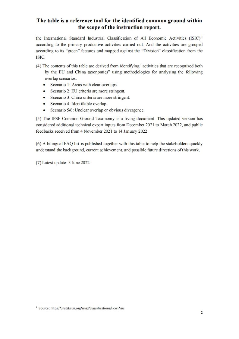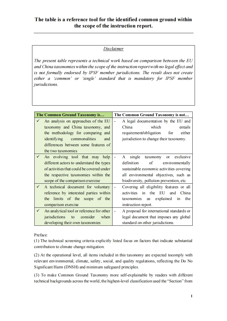 The table is a reference tool for the identified common ground withinthe scope of the instruction report.DisclaimerThe present table represents a technical work based on comparison between the EUand China taxonomies within the scope of the instruction reportwith no legal effect andis not formally endorsed by IPSF member jurisdictions.The result does not createeither a 'common'or 'single'standard that is mandatory for IPSF memberjurisdictions.The Common Ground Taxonomy is...The Common Ground Taxonomy is not...An analysis on approaches of the EUA legal documentation by the EU andtaxonomy and China taxonomy,andChinawhichentailsthe methodology for comparing andrequirement/obligationforeitheridentifyingcommonalitiesandjurisdiction to change their taxonomy.differences between some features ofthe two taxonomiesAn evolving tool that may helpA singletaxonomyor exclusivedifferent actors to understand the typesdefinitionofenvironmentallyof activities that could be covered undersustainable economic activities coveringthe respective taxonomies within theall environmental objectives,such asscope of the comparison exercisebiodiversity,pollution prevention,etc.A technical document for voluntaryCovering all eligibility features or allreference by interested parties withinactivities in the EU and Chinathe limits of the scope of thetaxonomies asexplained in thecomparison exerciseinstruction report.An analytical tool or reference for otherA proposal for international standards orjurisdictions to consider whenlegal document that imposes any globaldeveloping their own taxonomiesstandard on other jurisdictions.Preface:(1)The technical screening criteria explicitly listed focus on factors that indicate substantialcontribution to climate change mitigation.(2)At the operational level,all items included in this taxonomy are expected tocomply withrelevant environmental,climate,safety,social,and quality regulations,reflecting the Do NoSignificant Ham(DNSH)and minimum safeguard principles.(3)To make Common Ground Taxonomy more self-explainable by readers with differenttechnical backgrounds across the world,the highest-level classification used the"Section"from