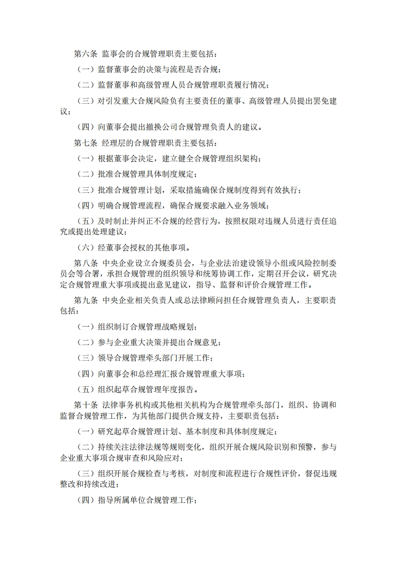中央企业合规管理指引(试行)第一章总则第一条为推动中央企业全面加强合规管理,加快提升依法合规经营管理水平,着力打造法治央企,保障企业持续健康发展,根据《中华人民共和国公司法》、《中华人民共和国企业国有资产法》等有关法律法规规定,制定本指引。第二条本指引所称中央企业,是指国务院国有资产监督管理委员会(以下简称国资委)履行出资人职责的国家出资企业。本指引所称合规,是指中央企业及其员工的经营管理行为符合法律法规、监管规定、行业准则和企业章程、规章制度以及国际条约、规则等要求。本指引所称合规风险,是指中央企业及其员工因不合规行为,引发法律责任、受到相关处罚、造成经济或声誉损失以及其他负面影响的可能性。本指引所称合规管理,是指以有效防控合规风险为目的,以企业和员工经营管理行为为对象,开展包括制度制定、风险识别、合规审查、风险应对、责任追究、考核评价、合规培训等有组织、有计划的管理活动。第三条国资委负责指导监督中央企业合规管理工作。第四条中央企业应当按照以下原则加快建立健全合规管理体系:(一)全面覆盖。坚持将合规要求覆盖各业务领域、各部门、各级子企业和分支机构、全体员工,贯穿决策、执行、监督全流程。(二)强化责任。把加强合规管理作为企业主要负责人履行推进法治建设第一责任人职责的重要内容。建立全员合规责任制,明确管理人员和各岗位员工的合规责任并督促有效落实。(三)协同联动。推动合规管理与法律风险防范、监察、审计、内控、风险管理等工作相统筹、相衔接,确保合规管理体系有效运行。(四)客观独立。严格依照法律法规等规定对企业和员工行为进行客观评价和处理。合规管理牵头部门独立履行职责,不受其他部门和人员的千涉。第二章合规管理职责第五条董事会的合规管理职责主要包括:(一)批准企业合规管理战略规划、基本制度和年度报告:(二)推动完善合规管理体系:(三)决定合规管理负责人的任免:(四)决定合规管理牵头部门的设置和职能:(五)研究决定合规管理有关重大事项:(六)按照权限决定有关违规人员的处理事项。