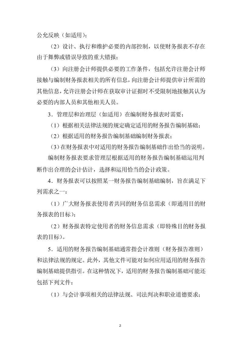 《中国注册会计师审计准则第1101号注册会计师的总体目标和审计工作的基本要求》应用指南(2019年3月29日修订)一、财务报表审计(一)审计范围(参见本准则第十八条)1.注册会计师对财务报表是否在所有重大方面按照适用的财务报告编制基础编制发表审计意见,这样的意见普遍适用于所有财务报表审计。但是,审计意见不是对被审计单位未来生存能力或管理层经营效率、效果提供的保证。此外,适用的法律法规可能要求注册会计师对其他特定事项(如内部控制的有效性、管理层报告与财务报表的一致性)发表意见。虽然审计准则及应用指南可能从这些事项与形成财务报表审计意见相关的角度提出一些要求并提供指引,但是当注册会计师负有额外责任对这些事项发表意见时,注册会计师还需要执行进一步工作。(二)财务报表的编制(参见本准则第十九条)2.法律法规可能规定了管理层和治理层(如适用)与财务报告相关的责任。尽管不同的国家或地区对这些责任的范围或表述方式的规定可能不尽相同,但注册会计师按照审计准则的规定执行审计工作的前提是相同的,即管理层和治理层(如适用)己认可并理解其应当承担下列责任:(1)按照适用的财务报告编制基础编制财务报表,并使其实现
