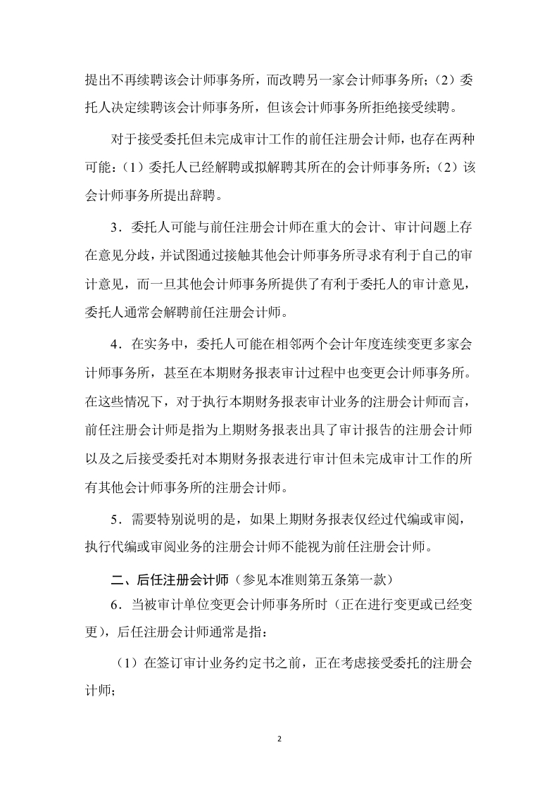 《中国注册会计师审计准则第1153号一前任注册会计师和后任注册会计师的沟通》应用指南(2019年3月29日修订)一、前任注册会计师(参见本准则第四条)1,.当被审计单位变更会计师事务所时(正在进行变更或己经变更),前任注册会计师通常是指:(1)已对上期财务报表发表了审计意见的某会计师事务所的注册会计师。例如,对于执行20×2年度财务报表审计业务的A会计师事务所的注册会计师而言,前任注册会计师是指执行20×1年度财务报表审计业务的B会计师事务所的注册会计师:(2)接受委托但未完成审计工作的某会计师事务所的注册会计师。例如,对于执行20×2年度财务报表审计业务的A会计师事务所的注册会计师而言,前任注册会计师是指之前接受委托执行20×2年度财务报表审计业务,但未完成审计工作的B会计师事务所的注册会计师。而20×1年度财务报表,可能是由B会计师事务所审计,也可能是由其他会计师事务所审计的。2.对于已对上期财务报表发表了审计意见的前任注册会计师,上期财务报表的审计工作完成后,该前任注册会计师所在的会计师事务所和委托人在审计业务委托关系上一般存在两种可能:(1)委托人y