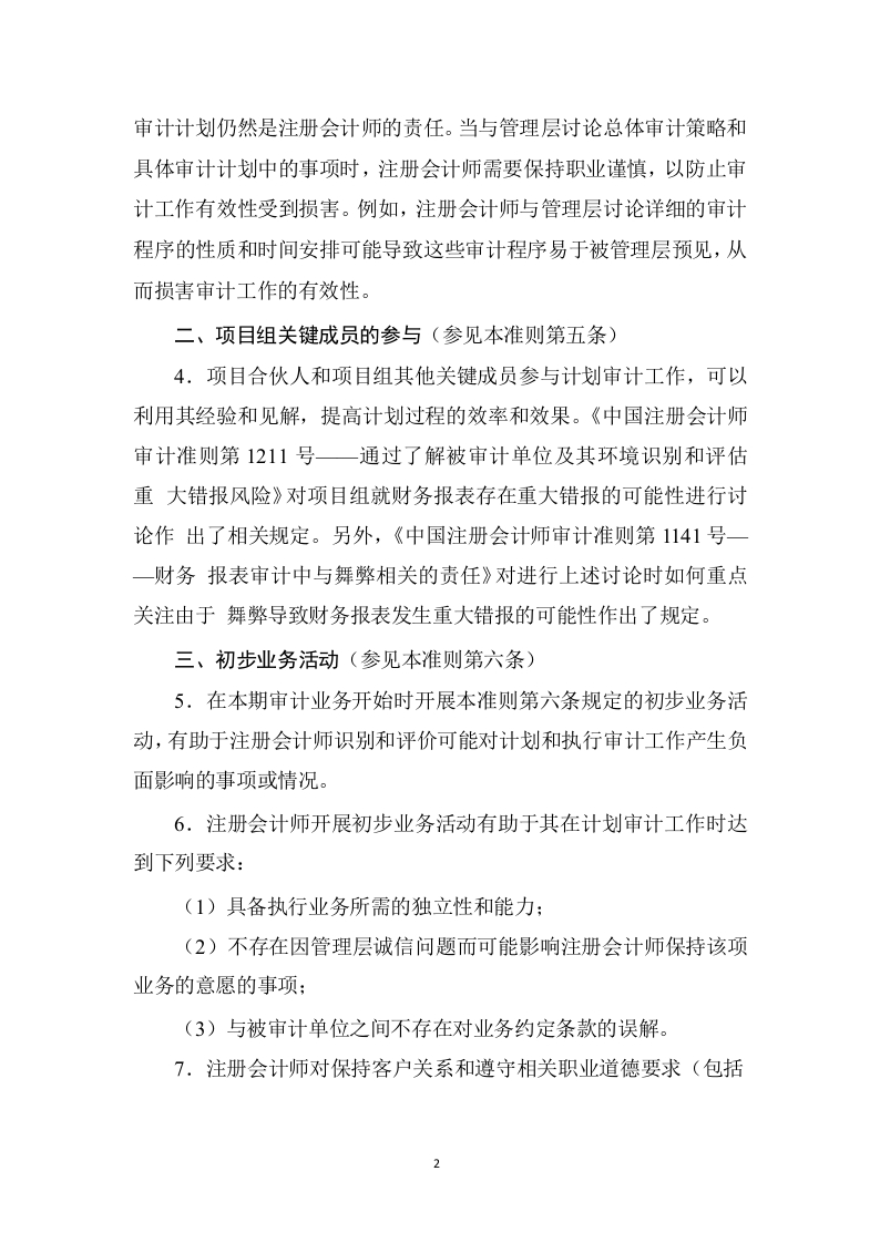 《中国注册会计师审计准则第1201号计划审计工作》应用指南(2019年3月29日修订)一、计划审计工作的作用和时间安排(参见本准则第三条)1.计划审计工作的性质和范围,因审计业务情况的变化、被审计单位的规模和复杂程度、项目组关键成员以前从被审计单位获得的经验的不同而不同。2.计划审计工作并非审计业务的一个孤立阶段,而是一个持续的、不断修正的过程。计划审计工作通常于上期审计工作结束后不久或伴随着上期审计工作的完成就开始了,直至本期审计工作结束为止。计划审计工作包括考虑某些活动的时间安排以及在进一步审计程序开始前必须完成的审计程序。例如,在识别和评估重大错报风险前,注册会计师需要在计划审计工作时考虑的事项包括:(1)用作风险评估程序的分析程序:(2)对适用于被审计单位的法律法规框架以及被审计单位如何遵守该框架的总体了解:(3)重要性的确定;(4)专家的参与:(5)实施的其他风险评估程序。3.注册会计师可能决定与管理层讨论审计计划的要素,从而使审计业务更易于执行和管理(如协调某些计划的审计程序与被审计单位员工的工作)。虽然这种讨论经常发生,制定总体审计策略和具体1