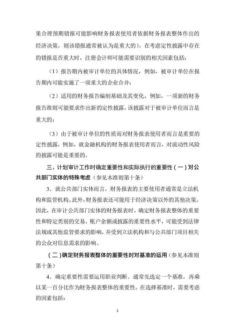 《中国注册会计师审计准则第1221号计划和执行审计工作时的重要性》应用指南(2019年3月29日修订)一、重要性与审计风险(参见本准则第六条)1.在执行财务报表审计工作时,注册会计师的总体目标是:(1)对财务报表整体是否不存在由于舞弊或错误导致的重大错报获取合理保证,使得注册会计师能够对财务报表是否在所有重大方面按照适用的财务报告编制基础编制发表审计意见:(2)按照审计准则的规定,根据审计结果对财务报表出具审计报告,并与管理层和治理层沟通。注册会计师通过获取充分、适当的审计证据将审计风险降至可接受的低水平,以获取合理保证。审计风险,是指当财务报表存在重大错报时,注册会计师发表不恰当审计意见的可能性。审计风险取决于重大错报风险和检查风险。注册会计师需要在整个审计过程中考虑重要性和审计风险,尤其是在下列重要审计环节:(1)识别和评估重大错报风险:(2)确定进一步审计程序的性质、时间安排和范围:(3)评价未更正错报对财务报表和形成审计意见的影响。二、审计中的重要性(参见本准则第七条)2.识别和评估重大错报风险需要运用职业判断,以识别各类交易、账户余额和披露(包括定性披露)中可能存在的重大错报(即如