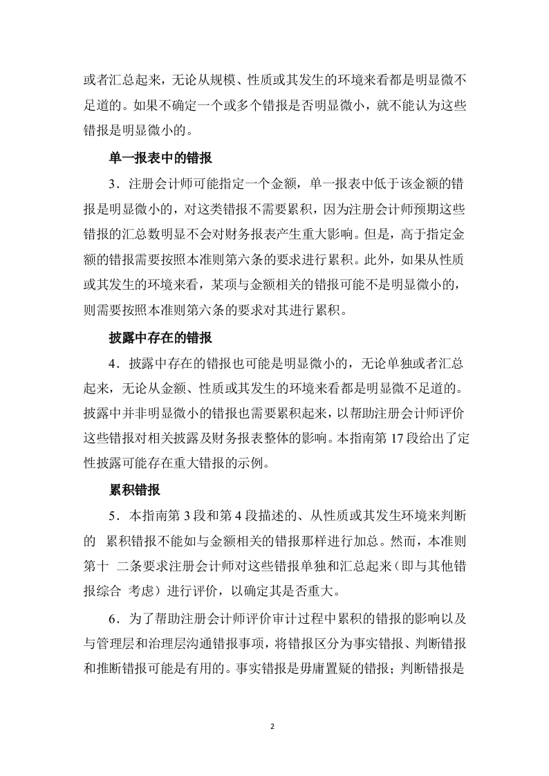 《中国注册会计师审计准则第1251号一评价审计过程中识别出的错报》应用指南(2019年3月29日修订)一、错报的定义(参见本准则第三条)1.错报可能由下列事项导致:(1)收集或处理用以编制财务报表的数据时出现错误:(2)遗漏某项金额或披露,包括不充分或不完整的披露,以及为满足特定财务报告编制基础的披露目标而被要求作出的披露(如适用):(3)由于疏忽或明显误解有关事实导致作出不正确的会计估计:(4)注册会计师认为管理层对会计估计作出不合理的判断或对会计政策作出不恰当的选择和运用。(5)信息的分类、汇总或分解不恰当。《(中国注册会计师审计准则第1141号一财务报表审计中与舞弊相关的责任〉应用指南》列举了由于舞弊导致的错报的例子。二、累积识别出的错报(参见本准则第六条)明显微小2.本准则第六条要求注册会计师累积在审计过程中识别出的错报,除非错报明显微小。“明显微小”不等同于“不重大”。明显微小错报金额的数量级与确定重大错报的数量级完全不同(明显微小错报的数量级更小),或其性质完全不同。这些明显微小的错报,无论单独1