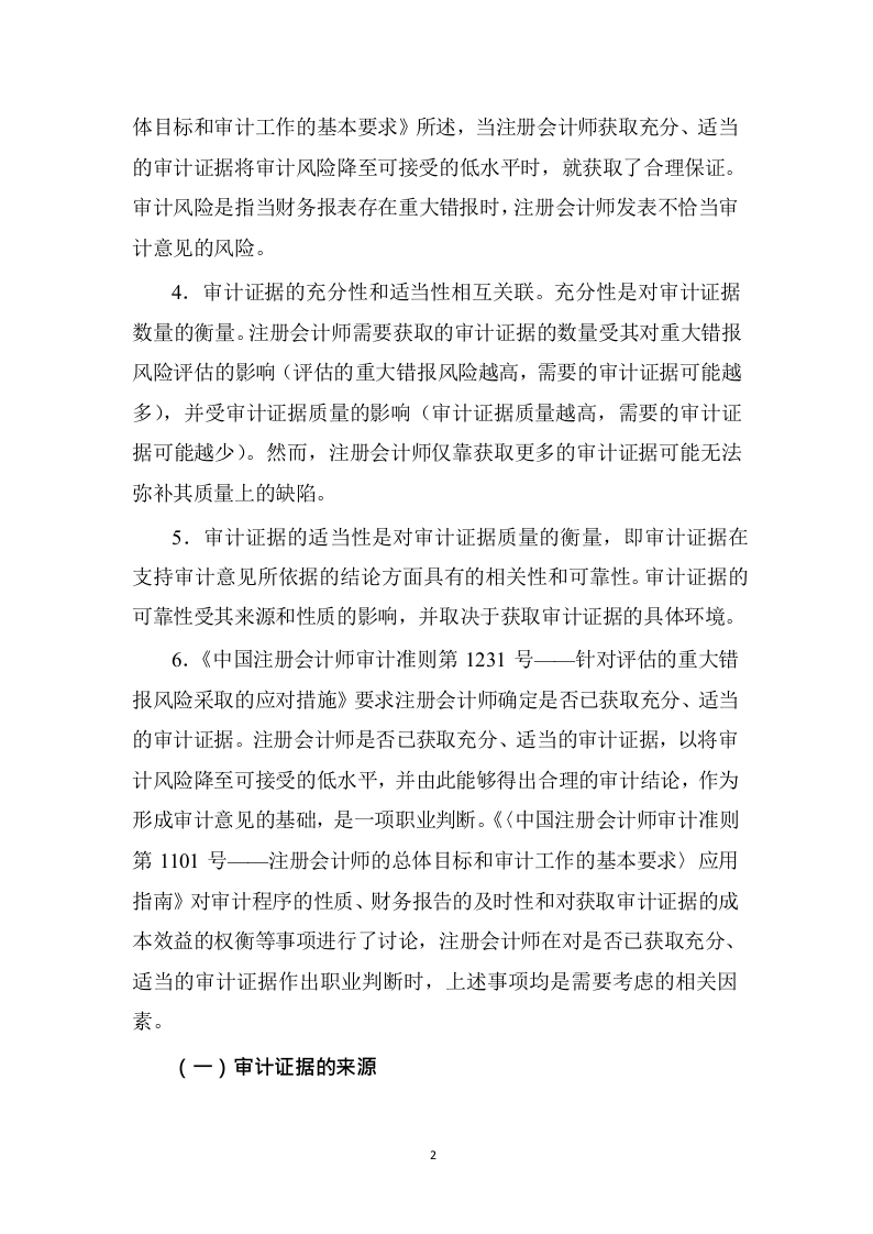 《中国注册会计师审计准则第1301号审计证据》应用指南(2019年3月29日修订)一、审计证据的充分性和适当性(参见本准则第十条)1,审计证据对于支持审计意见和审计报告是必要的。审计证据在性质上具有累积性,主要是在审计过程中通过实施审计程序获取的,也可能包括从其他来源获取的信息,如以前审计(前提是注册会计师已确定被审计单位及其环境自以前审计后是否已发生变化,进而可能影响这些信息对本期审计的相关性)或会计师事务所接受与保持客户时实施质量控制程序获取的信息。除从被审计单位内部和外部其他来源获取的信息外,会计记录也是重要的审计证据来源。可以用作审计证据的信息也可能在编制过程中利用了管理层的专家的工作。审计证据既包括支持和佐证管理层认定的信息,也包括与这些认定相矛盾的信息。在某些情况下,信息的缺乏(如管理层拒绝提供注册会计师要求的声明)本身也构成审计证据,可以被注册会计师利用。2.在形成审计意见的过程中,注册会计师的大部分工作是获取和评价审计证据。为获取审计证据而实施的审计程序包括询问、检查、观察、函证、重新计算、重新执行和分析程序。注册会计师通常将这些程序进行组合运用。尽管询问可以提供重要的审计证据,甚至可以提供某项错报的证据,但询问本身通常并不能为认定层次不存在重大错报和内部控制运行的有效性提供充分的审计证据。3.如《中国注册会计师审计准则第1101号一注册会计师的总1
