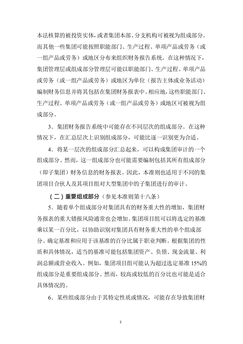 《中国注册会计师审计准则第1401号对集团财务报表审计的特殊考虑》应用指南(2019年3月29日修订)一、因法律法规要求或其他原因对组成部分进行审计(参见本准则第四条)1.在确定是否利用根据法律法规的要求或由于其他原因而对组成部分实施的审计为集团审计提供审计证据时,影响集团项目组决策的因素包括下列方面:(1)编制组成部分财务报表采用的财务报告编制基础,与编制集团财务报表采用的财务报告编制基础之间的差异:(2)组成部分注册会计师遵守的审计准则和其他职业准则,与在集团财务报表审计中遵守的审计准则和其他职业准则之间的差异:(3)是否可以及时完成组成部分财务报表审计,以满足集团报告的时间要求。二、定义(一)组成部分(参见本准则第十七条)2.集团结构影响如何识别组成部分。例如,有些集团的组织结构规定,由母公司、子公司、合营企业以及按权益法或成本法核算的被投资实体编制财务信息;或由集团本部、分支机构编制财务信息:或是将两者结合。这些集团的财务报告系统可能是按照这样的组织结构来组织的。相应地,母公司、子公司、合营企业以及按权益法或成
