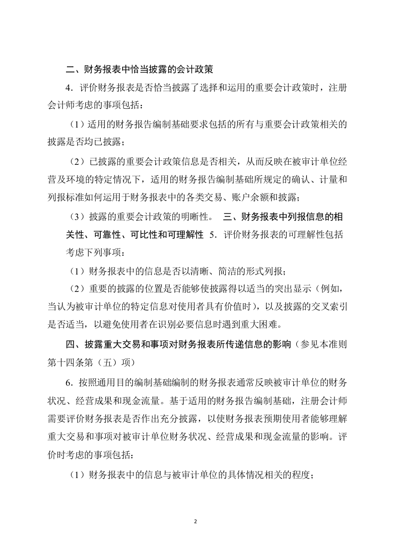 《中国注册会计师审计准则第1501号一对财务报表形成审计意见和出具审计报告》应用指南(2019年3月29日修订)一、被审计单位会计实务的质量(参见本准则第十三条)1.管理层需要对财务报表中的金额和披露作出大量判断。2.《中国注册会计师审计准则第1151号一与治理层的沟通》及其应用指南包含对会计实务质量方面的讨论。在考虑被审计单位会计实务的质量时,注册会计师可能注意到管理层判断中可能存在的偏向。注册会计师可能认为缺乏中立性产生的累积影响,连同未更正错报的影响,导致财务报表整体存在重大错报。管理层缺乏中立性可能影响注册会计师对财务报表整体是否存在重大错报的评价。缺乏中立性的迹象包括下列情形:(1)管理层对注册会计师在审计期间提请其注意的错报进行选择性更正。例如,如果更正某一错报将增加盈利,则对该错报予以更正,反之如果更正某一错报将减少盈利,则对该错报不予更正:(2)管理层在作出会计估计时可能存在偏向。3.《中国注册会计师审计准则第1321号一审计会计估计(包括公允价值会计估计)和相关披露》涉及管理层在作出会计估计时可能存在的偏向。在得出单项会计估计是否合理的结论时,可能存在管理层偏向的迹象本身并不构成错报。然而,这些迹象可能影响注册会计师对财务报表整体是否不存在重大错报的评价。1