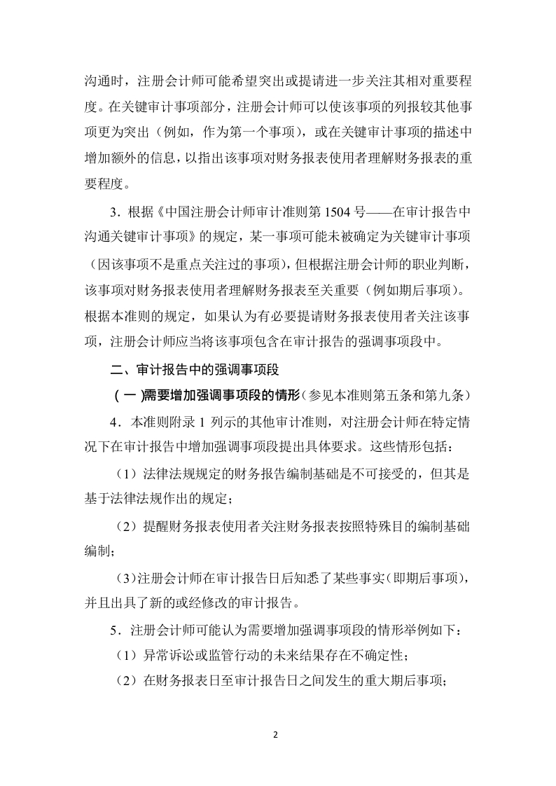 《中国注册会计师审计准则第1503号在审计报告中增加强调事项段和其他事项段》应用指南(2019年3月29日修订)一、审计报告中强调事项段和关键审计事项之间的关系(参见本准则第三条和第九条第(二)项)1.根据《中国注册会计师审计准则第1504号一在审计报告中沟通关键审计事项》的规定,关键审计事项是指注册会计师根据职业判断认为对本期财务报表审计最为重要的事项。关键审计事项从注册会计师已与治理层沟通过的事项中选取,后者包括本期财务报表审计中的重大审计发现。沟通关键审计事项能够为财务报表预期使用者提供额外的信息,以帮助其了解注册会计师根据职业判断认为对本期财务报表审计最为重要的事项。沟通关键审计事项还能够帮助预期使用者了解被审计单位,以及已审计财务报表中涉及重大管理层判断的领域。当《中国注册会计师审计准则第1504号一在审计报告中沟通关键审计事项》适用时,强调事项段的使用不能代替对某项关键审计事项的描述。2.按照《中国注册会计师审计准则第1504号一在审计报告中沟通关键审计事项》的规定被确定为关键审计事项的事项,根据注册会计师的职业判断,也可能对财务报表使用者理解财务报表至关重要。在这些情况下,按照《中国注册会计师审计准则第1504号在审计报告中沟通关键审计事项》的规定将该事项作为关键审计事项