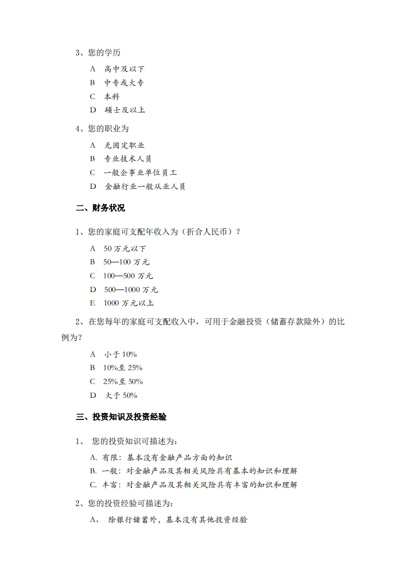 雏菊机构私募基金投资者风险调查问卷投资者姓名:填写日期:风险提示:私尊基金投资需承担各类风险,本金可能遭受损失。同时,私募基金投资还要考虑市场风险、信用风险、流动性风险、操作风险等各类投资风险。您在基金认购过程中应当注意核对自己的风险识别和风险承受能力,选择与自己风险识别能力和风险承受能力相匹配的私基基金。以下一系列问题可在您选择合适的私募基金前,协助评估您的风险承受能力、理财方式及投资目标。请签字承诺您是为自己购买私募基金产品【】请签字确认您符合以下何种合格投资者财务条件:符合金融资产不低于300万元(金融资产包括银行存款、股票、债券、基金份额、资产管理计划、银行理财产品、信托计划、保险产品、期货权益等X符合最近三年个人年均收入不低于50万元【】一、基本信息(包含身份信息、联系方式、年龄、学历、职业)1、您的姓名【联系方式【】证件类型【证件号码【】2、您的年龄介于A18-30岁B31-50岁C51-65岁D高于65岁