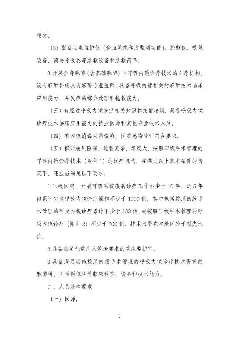 呼吸内镜诊疗技术管理规范(2013年版)为加强呼吸内镜诊疗技术临床应用与管理,规范呼吸内镜临床诊疗行为,保证医疗质量和医疗安全,根据《医疗技术临床应用管理办法》制定本规范。本规范为医疗机构及其医师开展呼吸内镜诊疗技术的基本要求。本规范所称的呼吸内镜诊疗技术主要包括可弯曲支气管镜、硬质气管/支气管镜、内科胸腔镜等诊疗技术。一、医疗机构基本要求(一)医疗机构开展呼吸内镜诊疗技术应当与其功能、任务相适应。(二)具有卫生计生行政部门核准登记的相关专业诊疗科目,有与开展呼吸内镜诊疗技术相关的辅助科室和设备,并满足下列要求:1.临床科室。(1)二级及以上医院,其中综合性医院设有呼吸相关疾病专业组,专科医院设有呼吸疾病相关科室。(2)每年收治呼吸系统疾病患者不少于500例。2.呼吸内镜工作室。(1)满足呼吸内镜诊疗技术临床工作要求,包括术前准备室、内镜诊疗室和术后观察室等。开展内科胸腔镜诊疗技术的医疗机构应具备满足无菌手术条件的内镜诊疗室或手术室。(2)配备满足呼吸内镜诊疗工作要求的内镜设备和相关器械、
