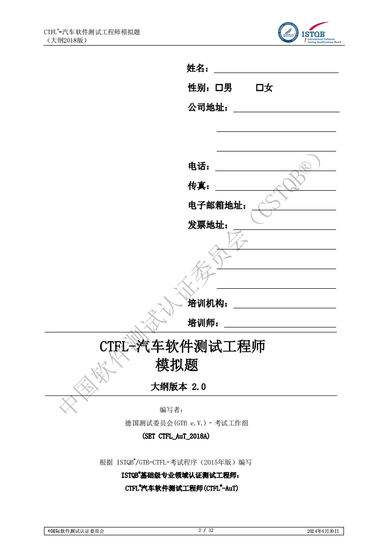 CT_AuT_汽车软件测试工程师2018版模拟卷答案v1.8_CN2.1(中文版)348072@abc1个月前发布关注私信0.96MB32页030CT_AuT_汽车软件测试工程师2018版模拟卷答案v1.8_CN2.1(中文版)此内容为付费资源,请付费后查看¥13¥19黄金会员免费钻石会员免费立即购买您当前未登录!建议登陆后购买,可保存购买订单付费资源 第1页 / 共32页 第2页 / 共32页 试读已结束,还剩30页,您可下载完整版后进行离线阅读 THE END初中教育医学类医疗医药单片机设计历史学类品牌营销哲学类土木工程学习资源小学教育标准规范高中教育高考真题 喜欢就支持一下吧收藏