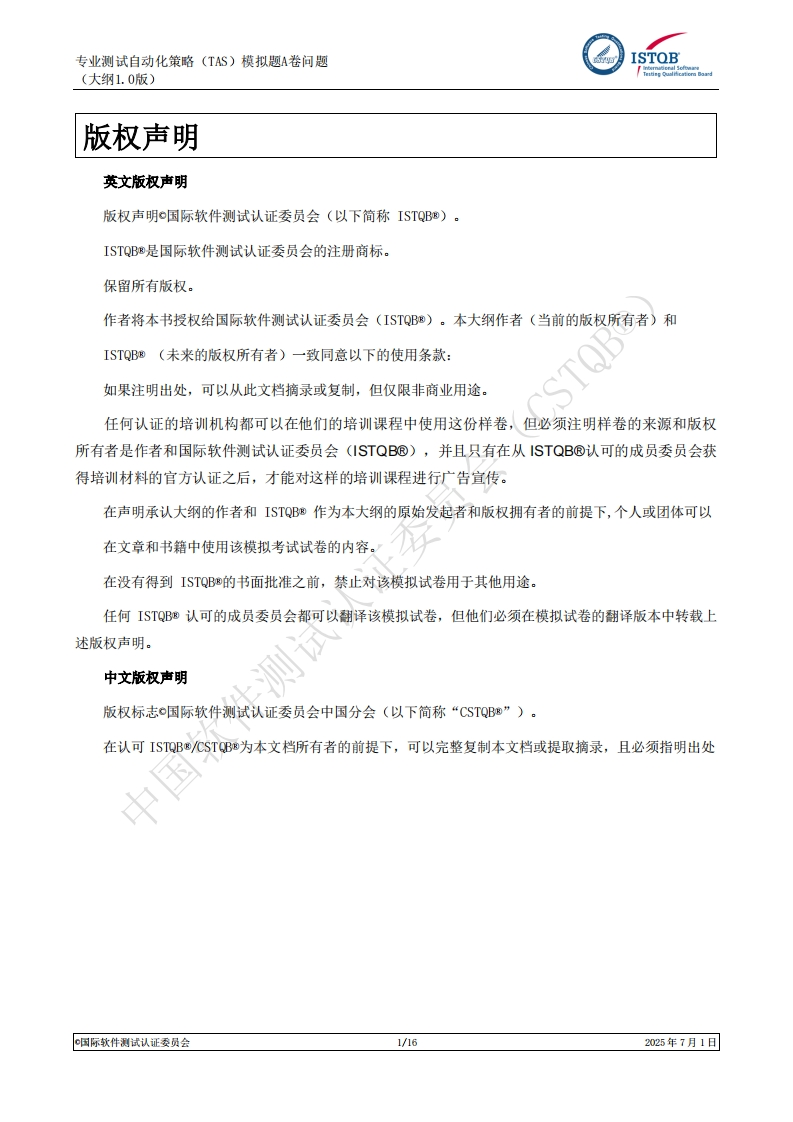 CT_TAS_测试自动化策略1.0版模拟卷A卷问题_v1.2_CN1.0(中文版)348072@abc1个月前发布关注私信0.99MB17页037CT_TAS_测试自动化策略1.0版模拟卷A卷问题_v1.2_CN1.0(中文版)此内容为付费资源,请付费后查看¥13¥19黄金会员免费钻石会员免费立即购买您当前未登录!建议登陆后购买,可保存购买订单付费资源 第1页 / 共17页 第2页 / 共17页 试读已结束,还剩15页,您可下载完整版后进行离线阅读 THE END初中教育医学类医疗医药单片机设计历史学类品牌营销哲学类土木工程学习资源小学教育标准规范高中教育高考真题 喜欢就支持一下吧收藏