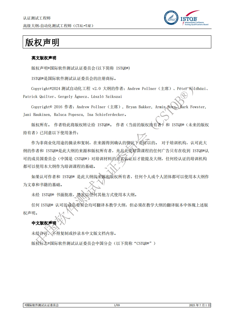 CTAL_TAE_测试自动化工程师大纲_v2.0_CN1.0(中文版)348072@abc1个月前发布关注私信2.32MB70页043CTAL_TAE_测试自动化工程师大纲_v2.0_CN1.0(中文版)此内容为付费资源,请付费后查看¥13¥19黄金会员免费钻石会员免费立即购买您当前未登录!建议登陆后购买,可保存购买订单付费资源 第1页 / 共70页 第2页 / 共70页 试读已结束,还剩68页,您可下载完整版后进行离线阅读 THE END初中教育医学类医疗医药单片机设计历史学类品牌营销哲学类土木工程学习资源小学教育标准规范高中教育高考真题 喜欢就支持一下吧收藏