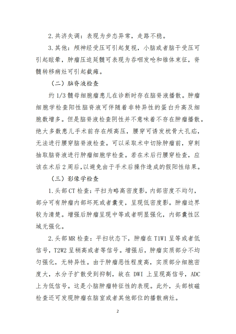 附件2儿童髓母细胞瘤诊疗规范(2021年版)一、概述髓母细胞瘤(medulloblastoma,MB)是儿童常见的颅内恶性肿瘤,其细胞形态类似胚胎期髓母细胞,故以此命名。MB约占儿童期中枢神经系统肿瘤的20%,发生率为0.2~0.58/10万人,男性略多于女性。髓母细胞瘤存在两个发病高峰,分别为3~4岁和8~10岁。绝大多数髓母细胞瘤为散发病例,不到5%的髓母细胞瘤患儿与家族性遗传性疾病相关,包括家族性腺瘤性息肉病(familial adenomatouspolyposis,FAP),痣样基底细胞癌综合征(nevoid basalcell carcinoma syndrome,NBCCS)。髓母细胞瘤起源于小脑或者脑干,容易发生经脑脊液播散转移。二、适用范围经肿瘤组织病理学确诊的0~18岁髓母细胞瘤初诊患儿。三、诊断(一)临床表现1.颅高压表现:约80%髓母细胞瘤发生于第四脑室区域,肿瘤生长可引起第四脑室和中脑导水管受压,导致梗阻性脑积水形成引起颅内压增高,表现为头痛、呕吐、视物模糊,甚至意识改变等。1