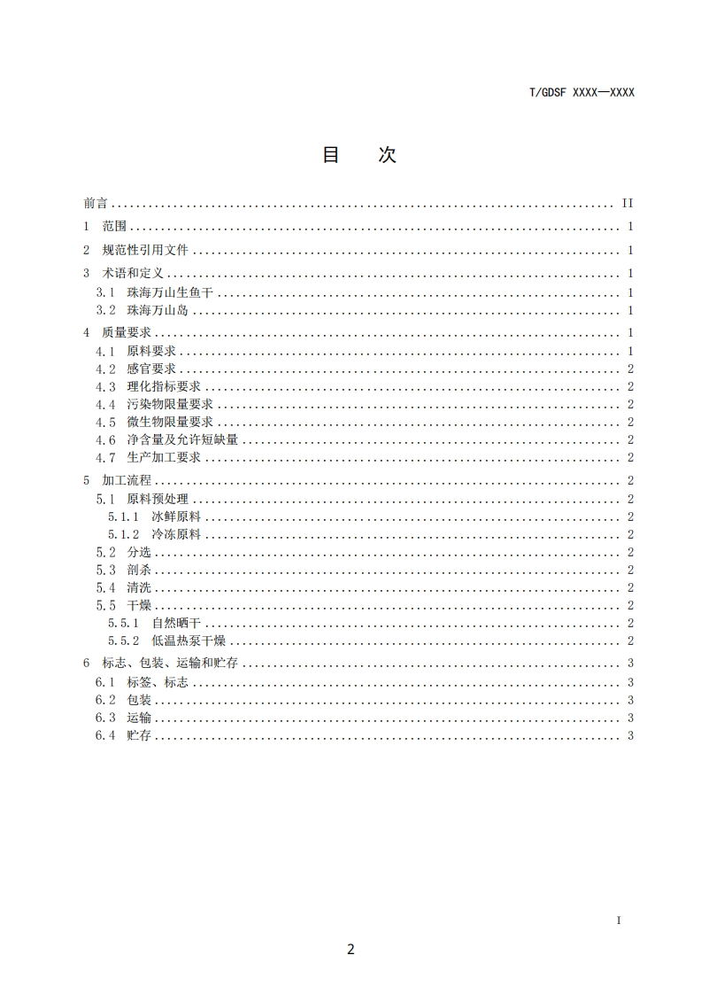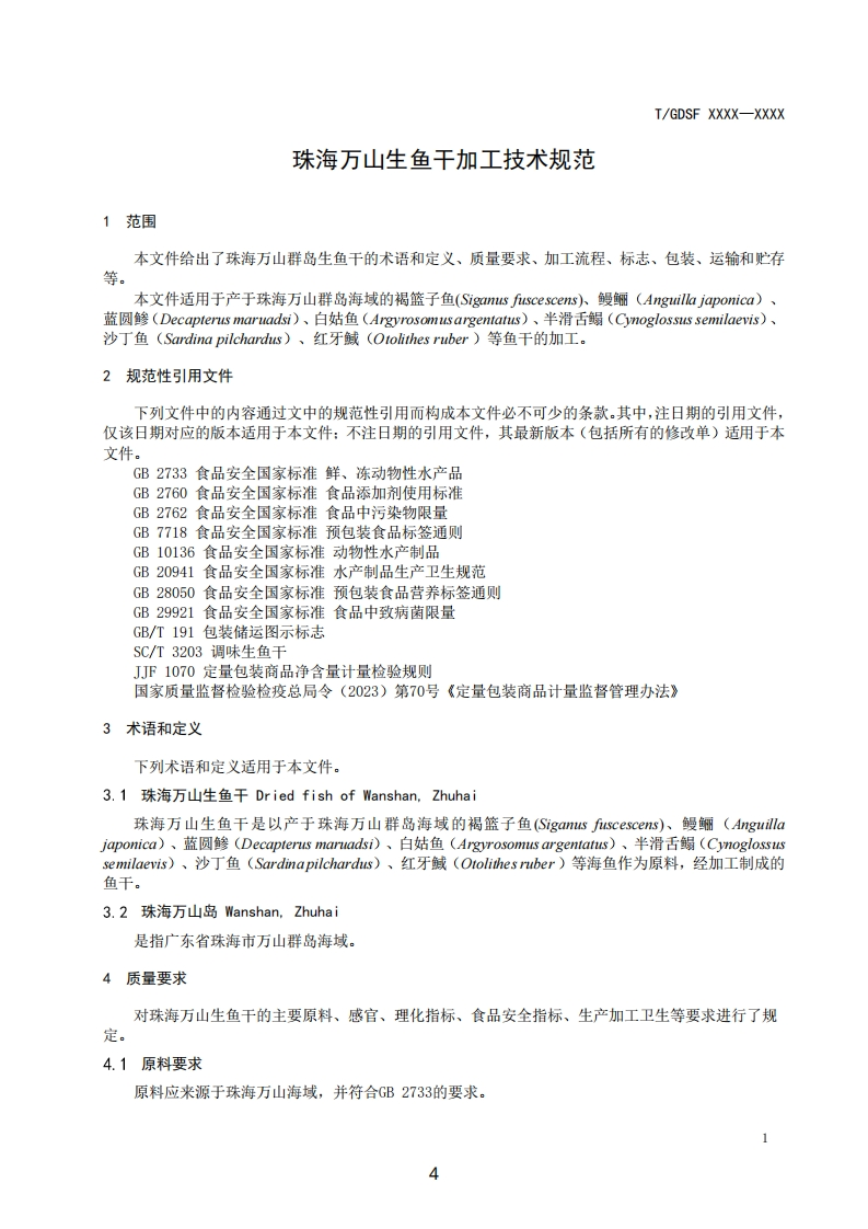 ICS67.120.30CCS X20TGDSF广东水产学会团体标准T/GDSF XXXX-XXXX珠海万山生鱼干加工技术规范Technical specification for the processing of dried fish of Wanshan,ZhuhaiXXXX-Xx-XX发布XXXX-x-XX实施广东水产学会发布1