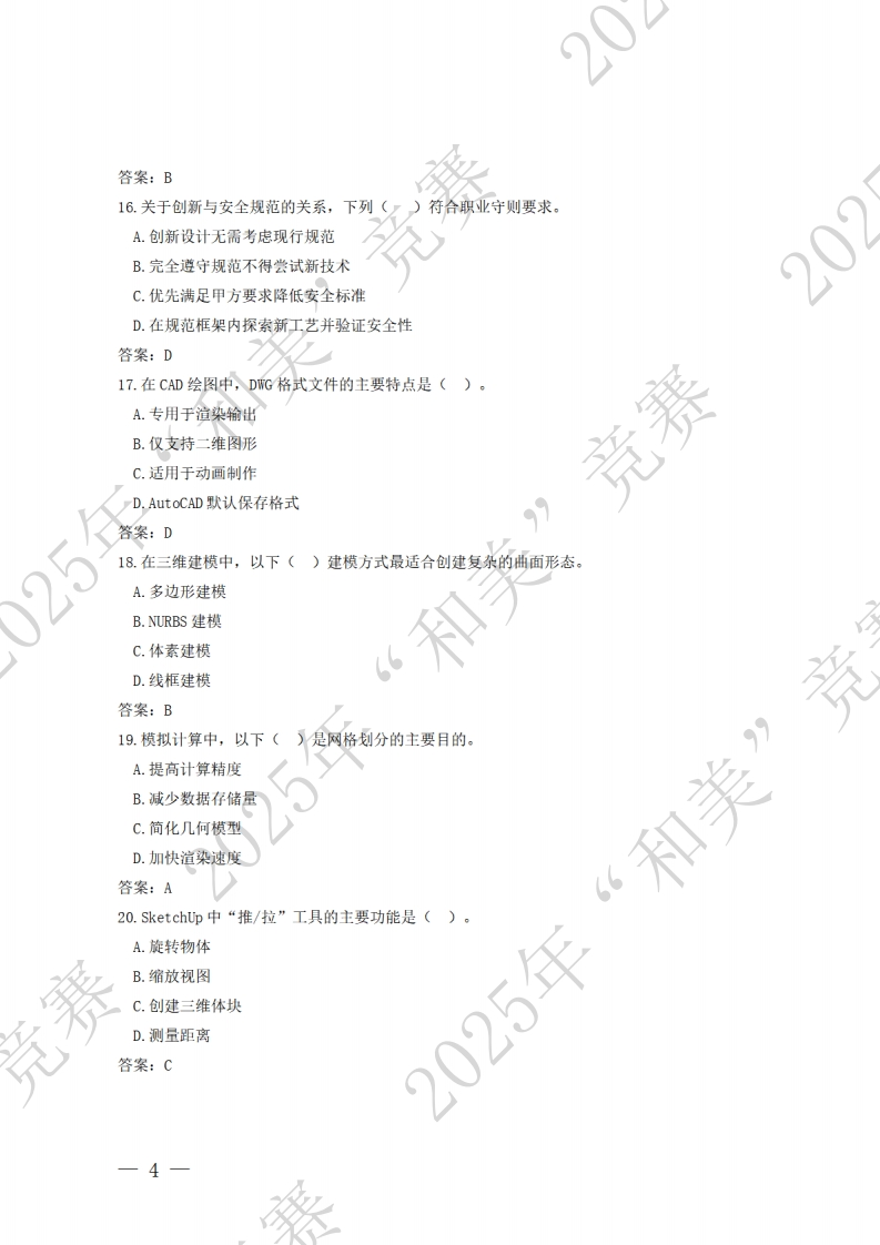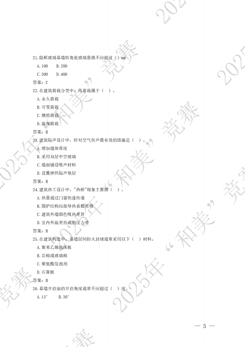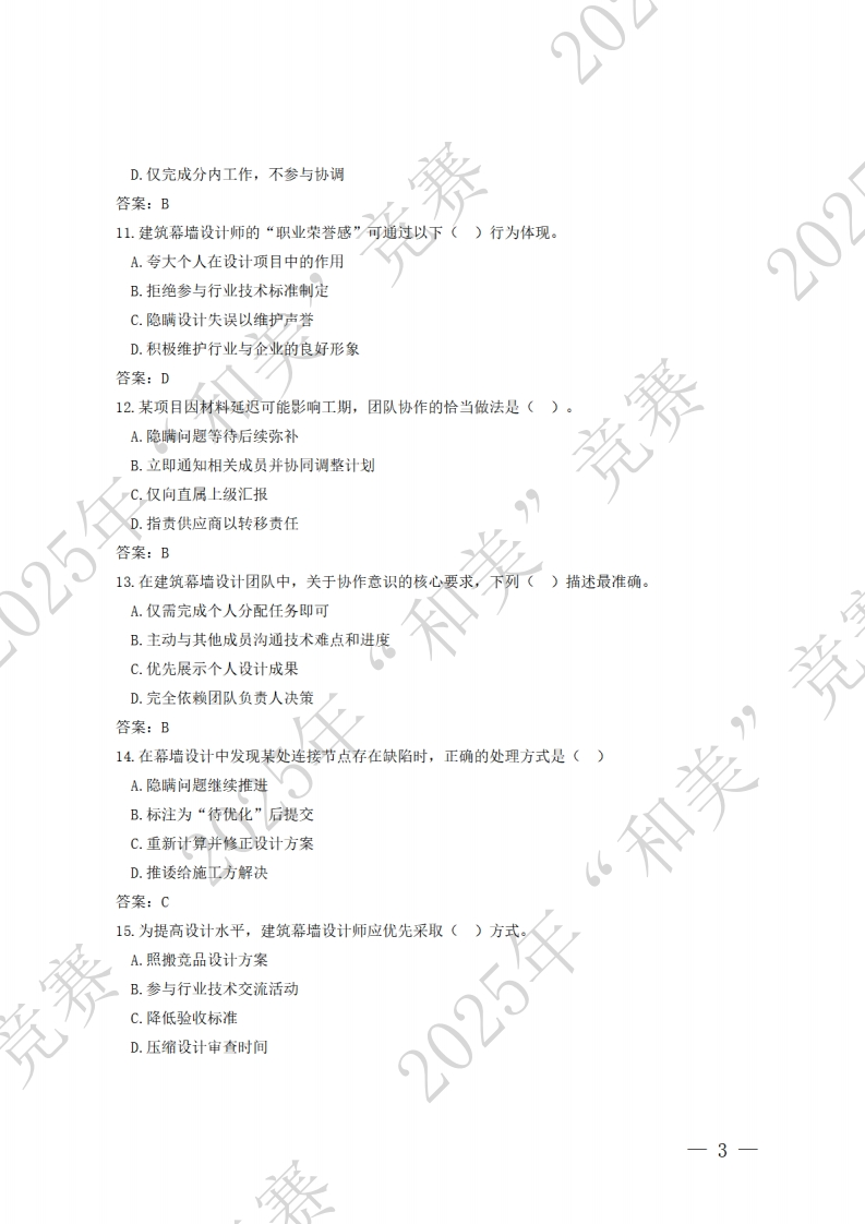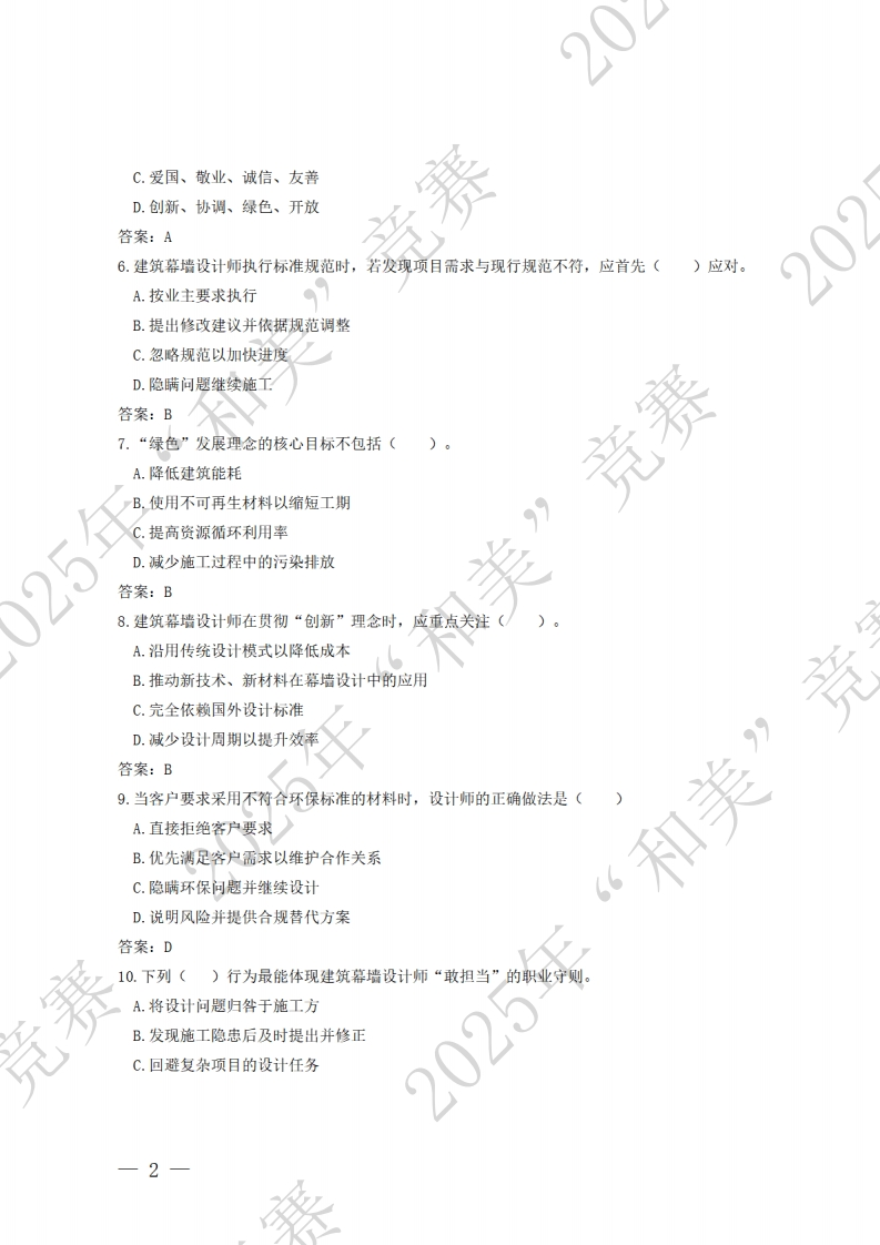 建筑幕墙设计师赛项理论知识题库2一、单选题(选择一个正确的答案,将相应的字母填入答卷,每题1分)201.职业道德区别于一般社会道德的主要特点是()。A.强制性B.普遍适用性C.行业特定性D.主观随意性答案:C2.职业道德是指从事一定职业的人在职业活动中应遵循的(A.职业纪律与法律法规B.行为准则和规范竞赛C.职业技能与操作流程D.企业管理制度与绩效考核答案:B3.职业道德的含义中,强调设计师应(。)处理与客户的关系。A.完全依赖客户意见,不提出专业建议B.通过夸大设计效果获取项目C.在合理范围内尊重客户需求并提出专业意见D.拒绝与客户沟通以保持设计独立性答案:C4.建筑幕墙设计师的职业道德要求中,下列()属于基木责任。A.隐瞒设计缺陷以维护公司声誉“和美”竞B.优先采用亲友提供的材料C.确保设计方案符合环保要求D.随意调整工期以降低施工成本答案:C5.建筑幕墙设计师在践行社会主义核心价值观时,应者重体现以下()层面的价值目标。A.富强、民主、文明、和谐B.自由、平等、公正、法治-1