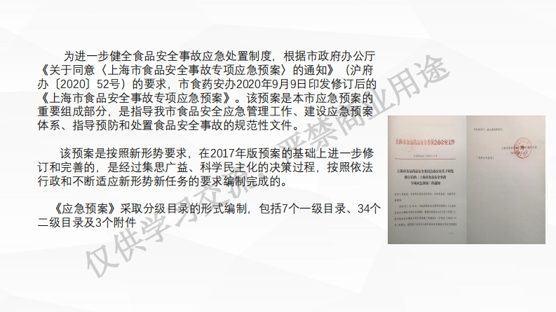 4.张仁伟-应急预案解读348072@abc1个月前发布关注私信1.34MB29页0494.张仁伟-应急预案解读此内容为付费资源,请付费后查看¥13¥19黄金会员免费钻石会员免费立即购买您当前未登录!建议登陆后购买,可保存购买订单付费资源 第1页 / 共29页 第2页 / 共29页 第3页 / 共29页 第4页 / 共29页 第5页 / 共29页 试读已结束,还剩24页,您可下载完整版后进行离线阅读 THE END标准规范 文本预览 《上海市食品安全事故专项应急预案》解读仅供学上海市市场监督管理局食品协调处2020年11月19日 查看更多 收起部分 喜欢就支持一下吧收藏
