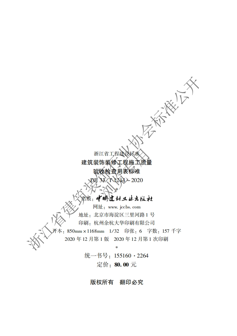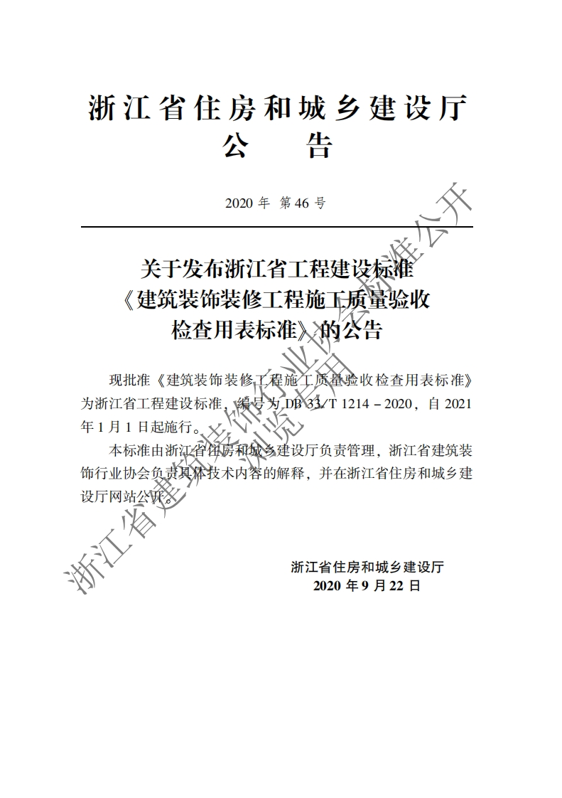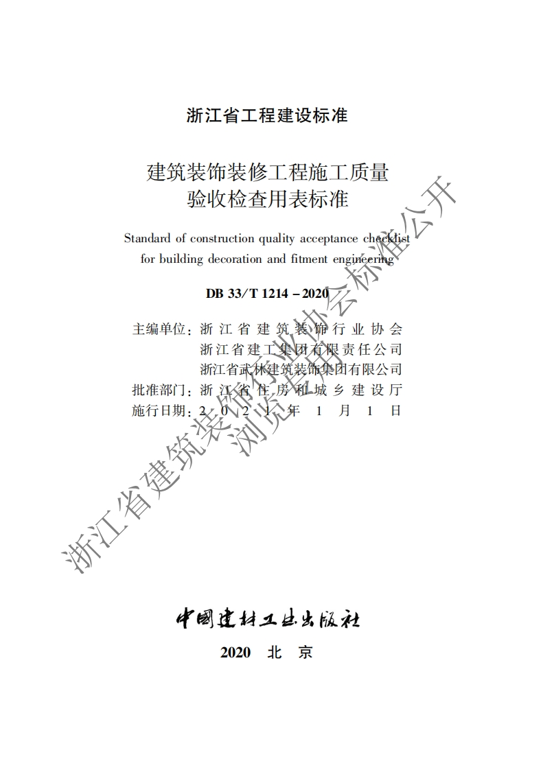 备案号:J15335-2020浙江省工程建设标准DB建筑装饰装修工程施工DB33/T1214-2020线装饰装修工胞验收检查用表标准Standard ofconstruction quality acceptance checklistfor building decoration and fitment engineering》闲浙江省建筑装饰侯中国建料工出出版社2020-09-22发布2021-01-01施行统一书号:155160·2264定价:8.0元浙江省住房和城乡建设厅发布