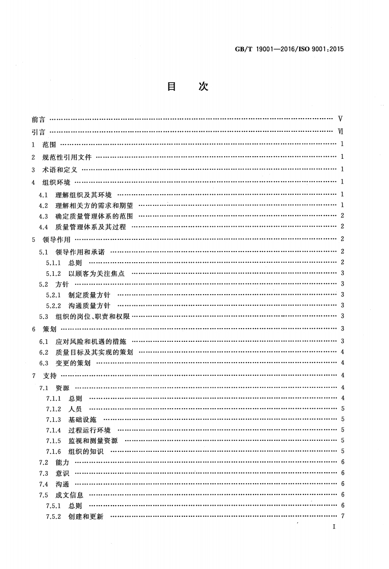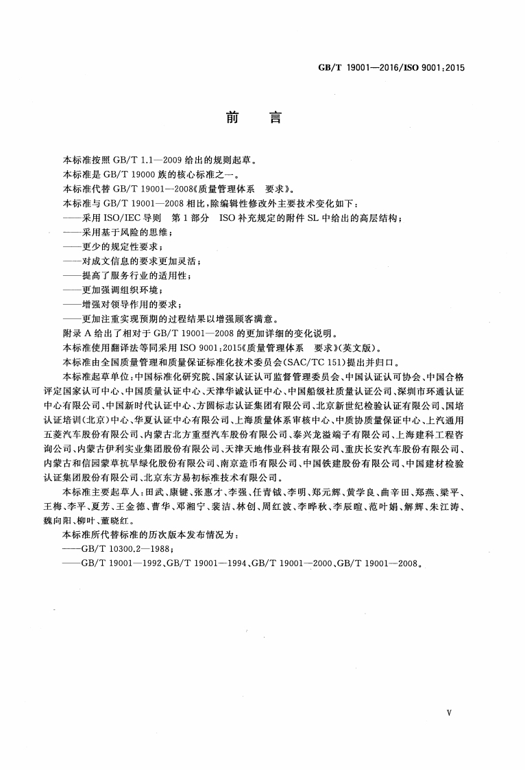 1Cs03.120.10A00GB中华人民共和国国家标准GB/T19001-2016/IS09001:2015代替GB/T19001一2008质量管理体系要求Quality management systems-Requirements(ISO9001:2015,IDT)2016-12-30发布2017-07-01实施中华人民共和国国家质量监督检验检疫总局中国国家标准化管理委员会发布