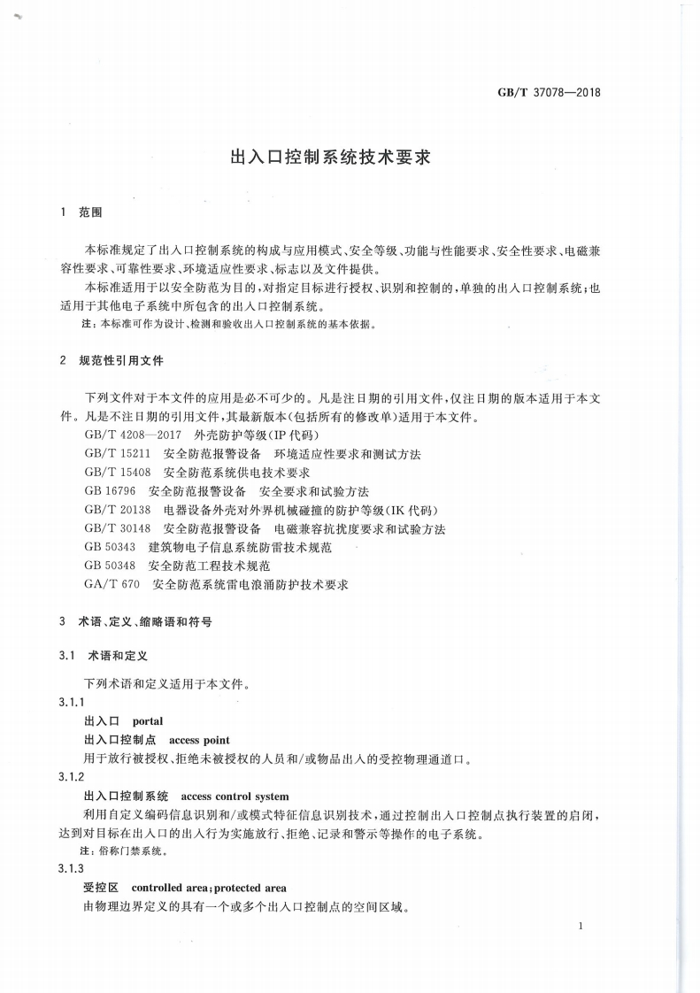 GBT37078-2018-出入口控制系统技术要求348072@abc1个月前发布关注私信10.95MB31页035GBT37078-2018-出入口控制系统技术要求此内容为付费资源,请付费后查看¥13¥19黄金会员免费钻石会员免费立即购买您当前未登录!建议登陆后购买,可保存购买订单付费资源 第1页 / 共31页 第2页 / 共31页 第3页 / 共31页 第4页 / 共31页 第5页 / 共31页 试读已结束,还剩26页,您可下载完整版后进行离线阅读 THE END标准规范 文本预览 ICS13.310A91GB中华人民共和国国家标准GB/T37078-2018出入口控制系统技术要求Technical specifications for access control system2018-12-28发布2019-07-01实施国家市场监督管理总局中国国家标准化管理委员会发布Φ涂器查真 查看更多 收起部分 喜欢就支持一下吧收藏