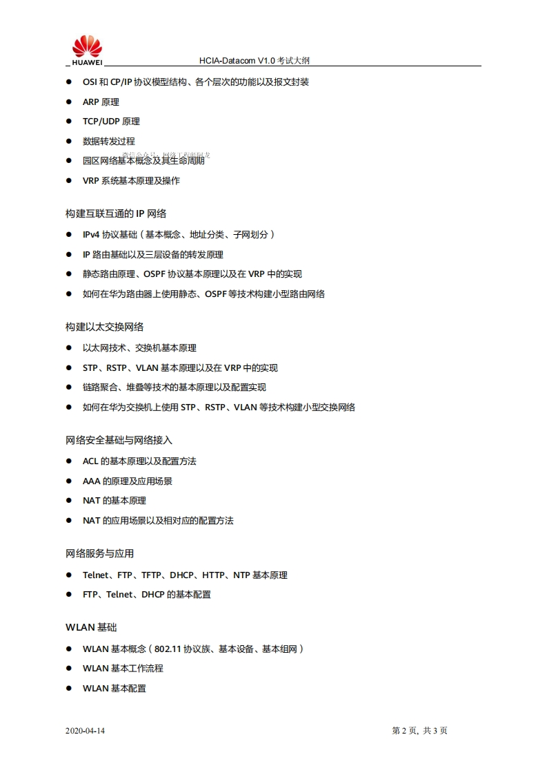 HUAWEIHCA-Datacom V1.0考试大纲HCIA-Datacom V1.0考试大纲华为认证HCA-Datacom认证考减T程阿龙认证名称考试代码考试名称语言考试费用考试时长通过分数/总分HCIA-H12-811HCIA-Datacom V1.0CHS/ENU200USD90min600/1000Datacom考试内容HCIA-Datacom V1.0考试覆盖数通础知识,包括TCP/IP协议栈基础知识,OSPF路由协议基本原理以及在华为路由器中的配置实现,以太网技术、生成树、VLAN原理、堆叠技术以及在华为交换机中的配置实现,网络安全技术以及在华为路由交换设备中的配置实现,WLAN相关技术与基本原理以及在华为无线设备中的配置实现,SNMP等网络管理的基本原理,PPP等广域网协议基本原理以及在华为路由器中的配置实现,IPv6的基础知识以及ICMPve6、DHCPv(6协议基本原理和配置实现,SDN基本原理以及华为相应产品与解决方案的实现,编程自动花叁原理。工程狮阿龙知识点占比章节此数据通信与网络基础8%构建互联互通的P网络27%构建以太交换网络28%网络安全基础与网络接入8%网络服务与应用5%WLAN基础109%广域网基础3%网络管理与运维3%IPv6基础5%SDN与自动化基础3%知识点数据通信与网络基础·数通基础知识·网络基本概念、P网络构架、标准化组织与协议2020-04-14第1页,共3页