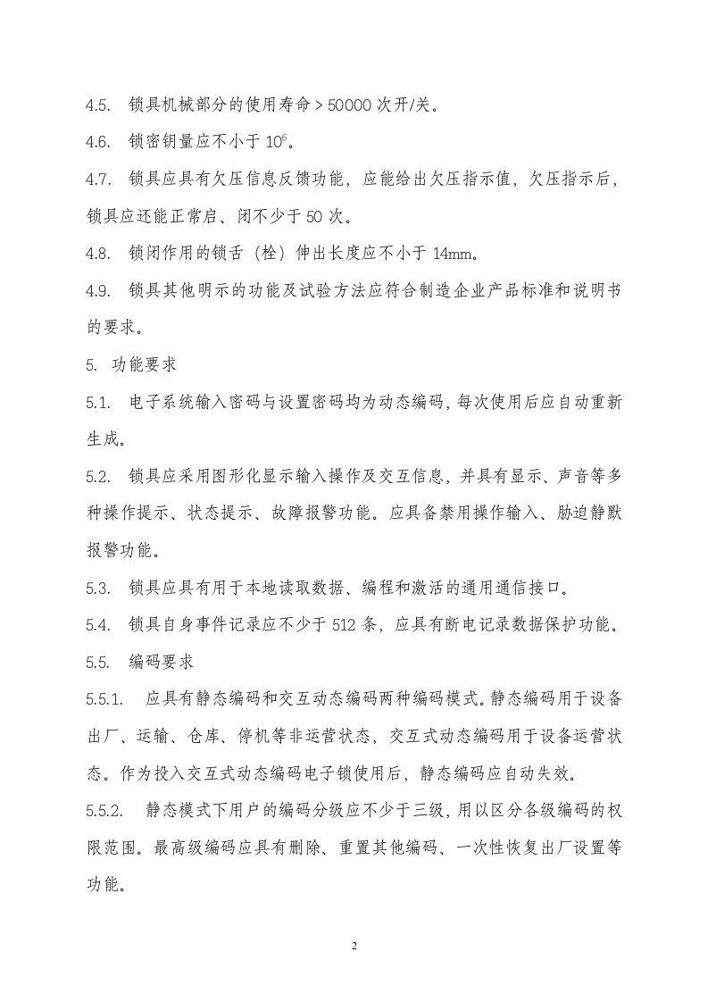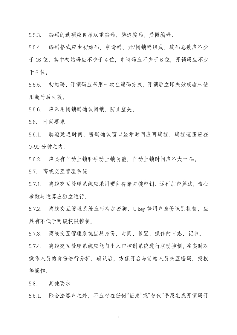 本市离线交互式动态编码电子锁技术规范1.范围本规范对本市离线交互式动态编码电子锁提出了基本技术要求,是产品选型、检测及相关工程评审、验收的主要技术依据。2.定义以离线交互方式实现对现场操控人员身份、设备位置、动态电子密码等信息的确认、授权,通过电子系统输入密码与设置密码比对,由机电执行机构控制柜门(锁舌)启闭的锁具。3.组成离线交互式动态编码电子锁由离线交互管理系统、动态编码控制装置和电子密码锁闭机构等组成。4.基本要求4.1.基本技术要求应符合《防盗保险柜》(GB10409-2001)中5.4.1-5.4.3、5.4.6、5.4.8-5.4.9的要求,强度应满足《电子防盗锁》(GA/T374-2001)中5.55.6中相应等级的要求,环境适应性、抗干扰、安全性、稳定性、耐久性、安装等应符合《电子防盗锁》(GAT374-2001)中5.7-5.12的要求。4.2.锁具核心加密电路应处于保险柜内,外部显示及输入面板不应包含加密运算电路。4.3.锁具维护时应能正常工作且不丢失数据。4.4.锁舌应具有抗卡阻能力。电机类驱动插芯锁锁舌在启闭行程中锁舌行程方向推拉力应不小于5N。