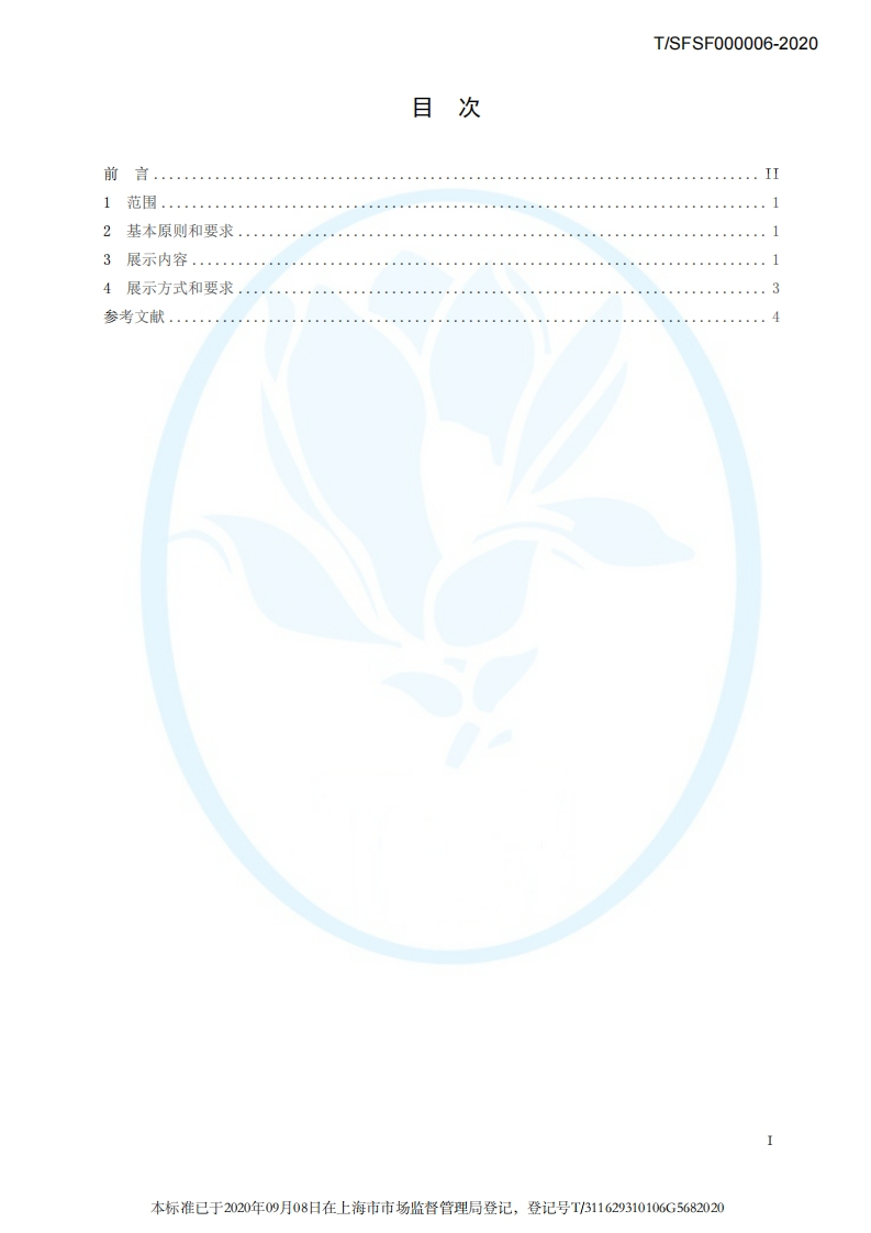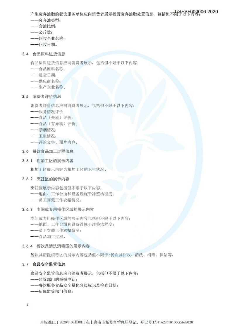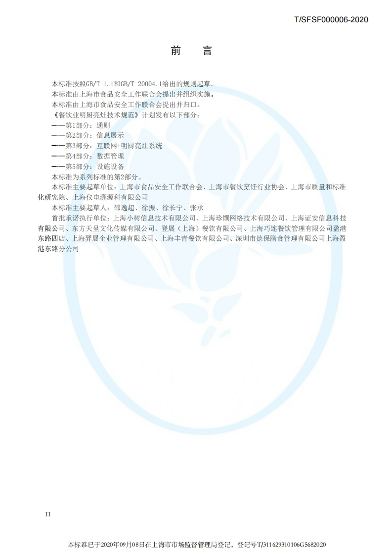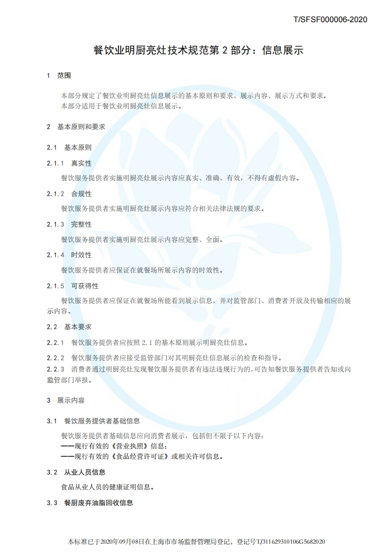 本标准已于2020年09月08日在上海市市场监督管理局登记,登记号T/311629310106G56820201C5号:67.020中国标准文献分类号:X00团体标准T/5FSF000006-2020餐饮业明厨亮灶技术规范第2部分:信息展示Technical specification for visualization kitchen forcatering service Part 2 Information presentation2020-08-03发布2020-11-03实施上海市食品安全工作联合会发布2008049762363