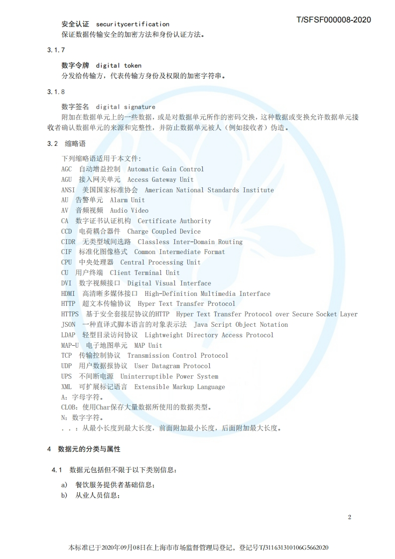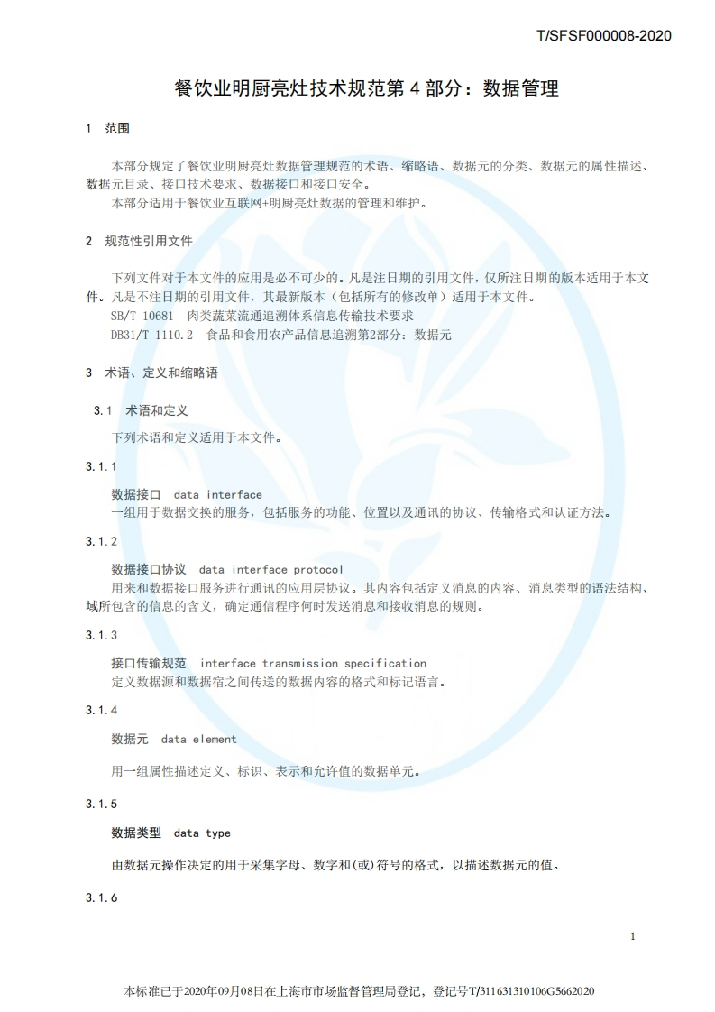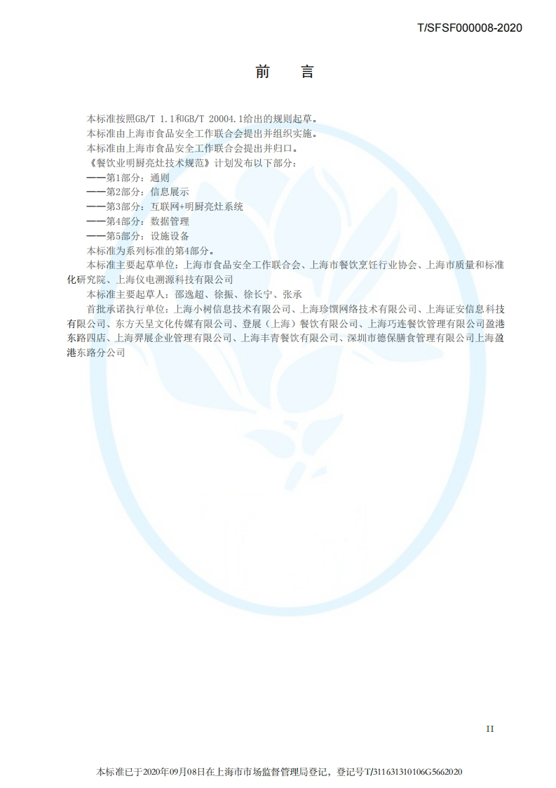本标准已于2020年09月08日在上海市市场监督管理局登记,登记号T/311631310106G56620201C5号:67.020中国标准文献分类号:X00团体标准T/5FsF000008-2020餐饮业明厨亮灶技术规范第4部分:数据管理Technical specification for visualization kitchen forcatering service Part 4:Data management2020-08-03发布2020-11-03实施上海市食品安全工作联合会发布2008049762992