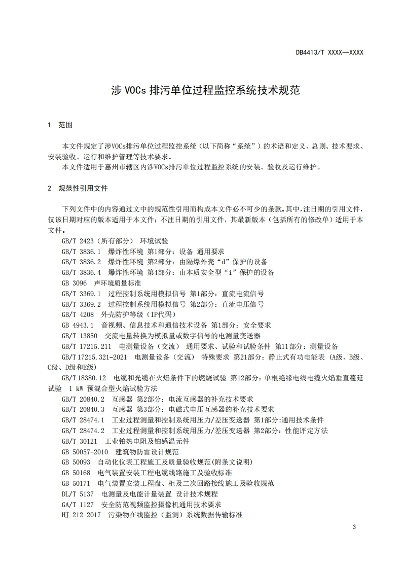 ICS13.020.10CCS Z 01DB4413惠州市地方标准DB4413/T XXXX-XXXX涉V0Cs排污单位过程监控系统技术规范Specifications of process monitoring system for VOCs pollutant discharge units(征求意见稿)在提交反馈意见时,请将您知道的相关专利连同支持性文件一并附上。XXXX-Xx-XX发布XXXX-Xx-XX实施惠州市市场监督管理局发布