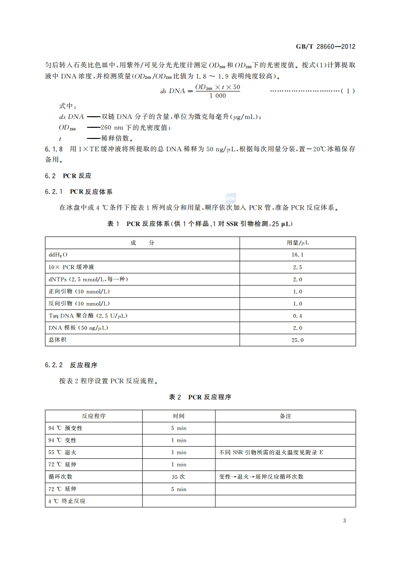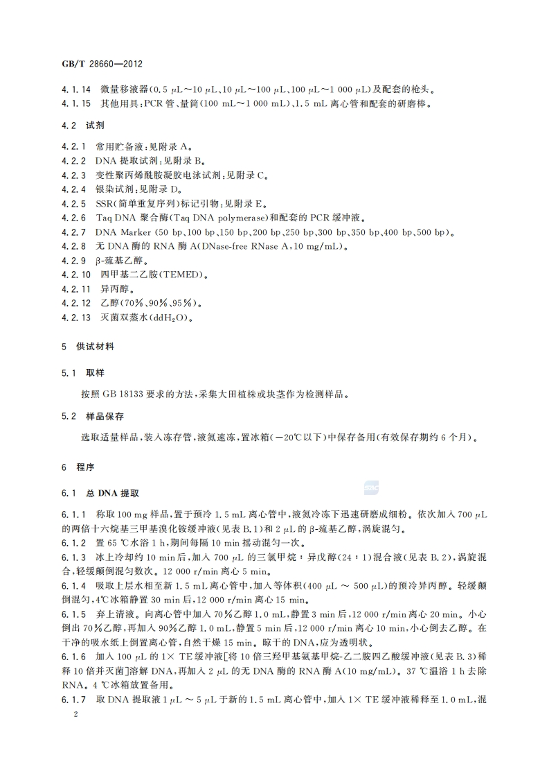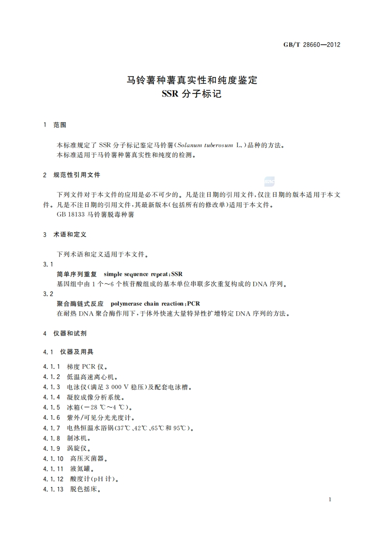 马铃薯种薯-28660-2012-gbt-e-300348072@abc3个月前发布关注私信0.46MB16页045马铃薯种薯-28660-2012-gbt-e-300此内容为付费资源,请付费后查看¥13¥19黄金会员免费钻石会员免费立即购买您当前未登录!建议登陆后购买,可保存购买订单付费资源 第1页 / 共16页 第2页 / 共16页 第3页 / 共16页 第4页 / 共16页 第5页 / 共16页 试读已结束,还剩11页,您可下载完整版后进行离线阅读 THE END标准规范 文本预览 ICs65.020B04中华人民共和国国家标准GB/T28660一2012@马铃薯种薯真实性和纯度鉴定SSR分子标记Genuineness and purity verification of potato seed-tuber-SSR molecular marker2012-09-03发布2012-11-01实施中华人民共和国国家质量监督检验检疫总局发布中国国家标准化管理委员会 查看更多 收起部分 喜欢就支持一下吧收藏