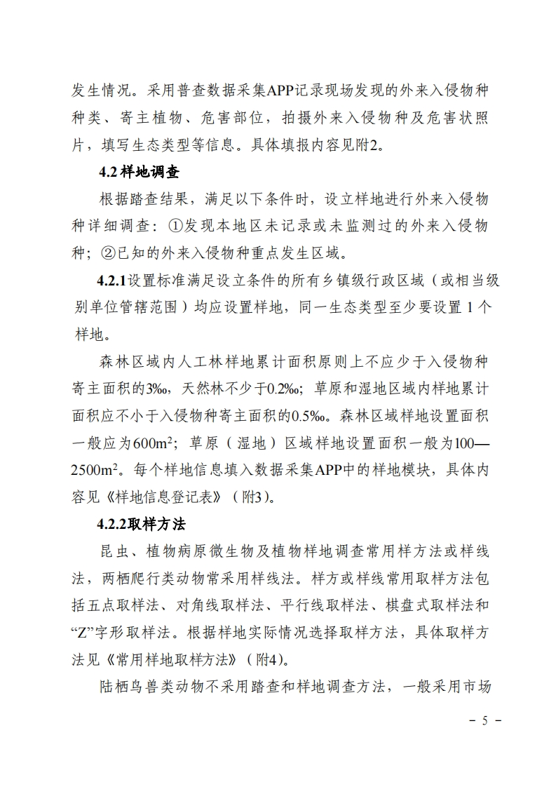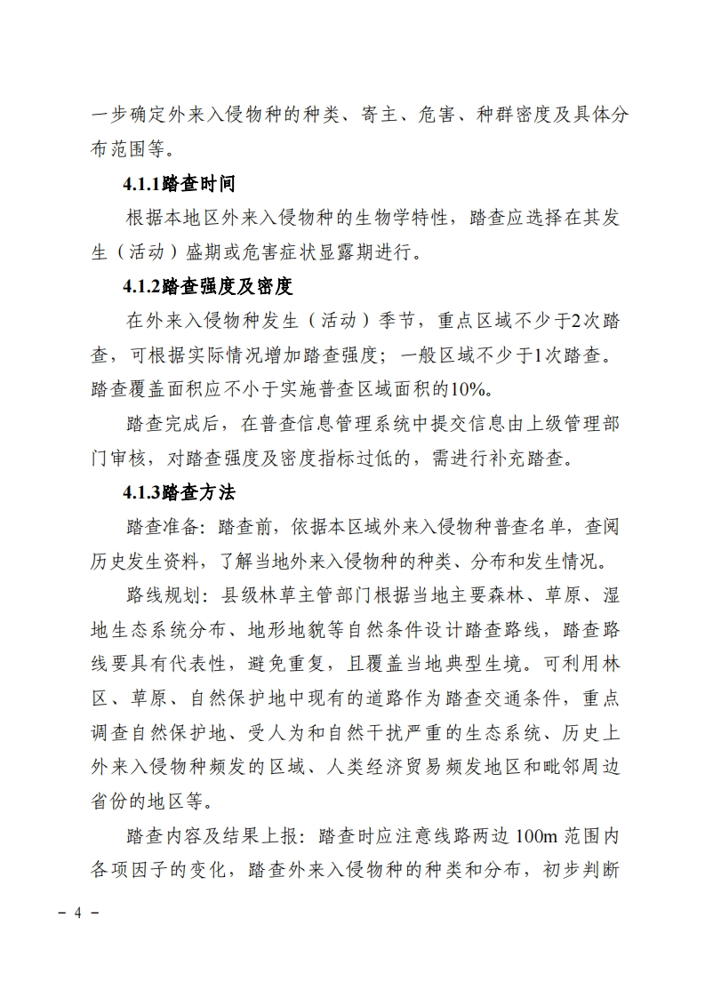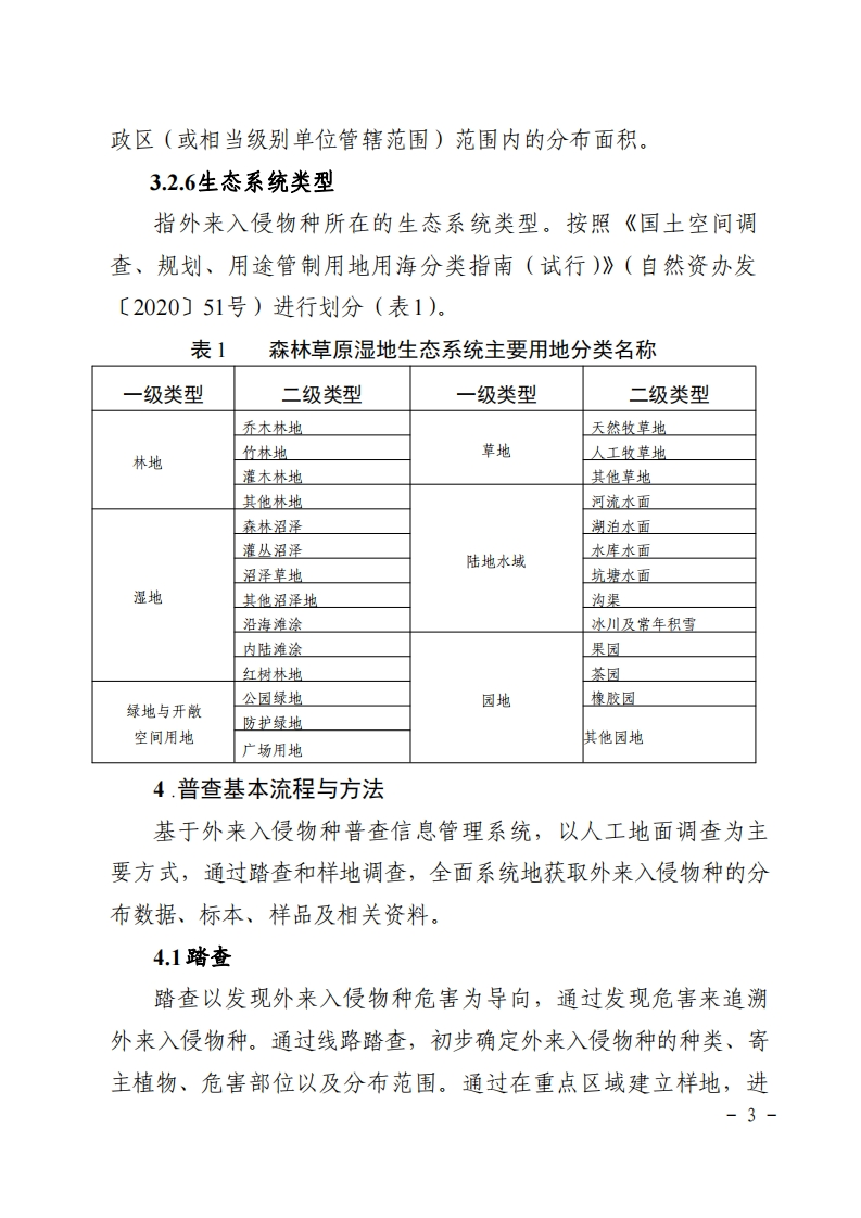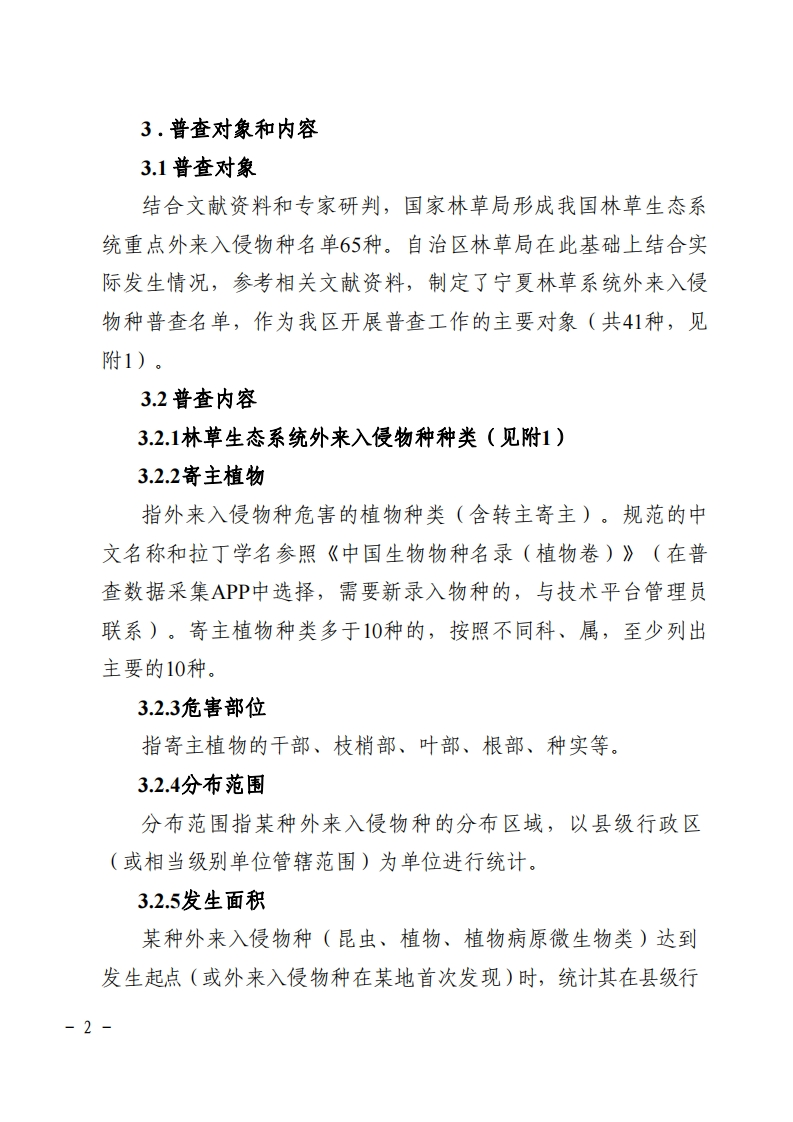 附件:宁夏森林草原湿地生态系统外来人侵物种普查技术规程为规范普查技术,指导各市、县(区)及保自然护地做好森林、草原、湿地生态系统(以下简称“林草生态系统”)外来入侵物种普查工作,根据《全国森林、草原、湿地生态系统外来入侵物种普查工作方案》和《全国森林、草原、湿地生态系统外来入侵物种普查技术规程》,制定本技术规程。1.总体目标以初步掌握的外来入侵物种为基础,用2年左右的时间,在全区范围内组织开展林草生态系统外来入侵物种普查,查清我区森林、草原、湿地三大生态系统重点外来入侵物种的基本情况。开展外来入侵物种风险和危害评估,提出我区主要林草外来入侵物种预防及治理策略,为制定外来入侵物种的管理防治规划,保护森林、草原和湿地资源、维护国土生态安全,提供全面、准确、客观的基础数据信息。2.普查范围全区所有陆地国土上的森林、草原、湿地生态系统。重点区域:自然保护地、受人为和自然干扰严重的林草生态系统、经济贸易往来和人类活动频繁地区、边境地区及主要入境口岸等外来入侵物种重点分布区。-1-