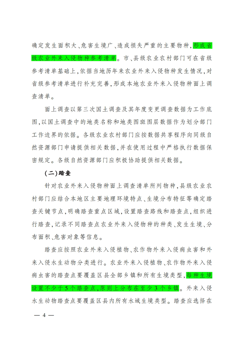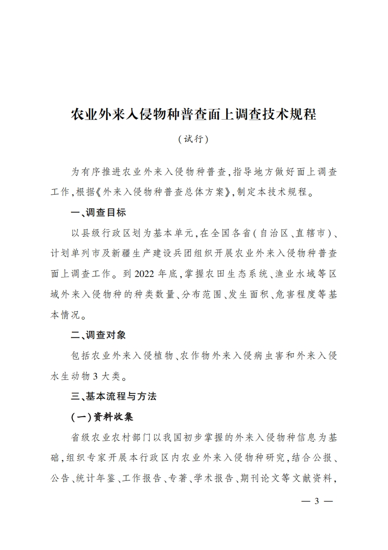 农业农村部办公厅文件自然资源部办公厅农办科〔2022〕8号农业农村部办公厅自然资源部办公厅关于印发《农业外来人侵物种普查面上调查技术规程(试行)》的通知各省、自治区、直辖市农业农村(农牧)厅(局、委)、自然资源主管部门、新疆生产建设兵团农业农村局、自然资源局:为落实《外来入侵物种普查总体方案》,扎实推进农业外来入侵物种普查面上调查工作,我们制定了《农业外来入侵物种普查面上调查技术规程(试行)》。现印发给你们,请结合实际认真-1