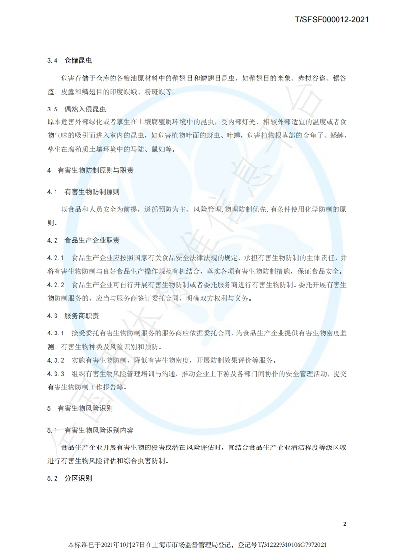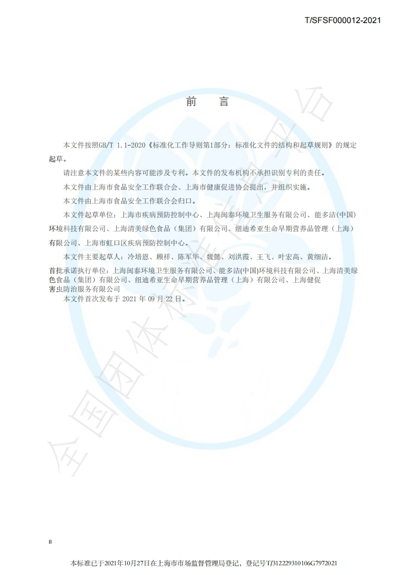 本标准已于2021年10月27日在上海市市场监督管理局登记,登记号T/312229310106G79720211C5号:67.040中国标准文献分类号:C53团体标准T/SFSF000012-2021食品生产企业有害生物风险管理指南Guidelines for pest risk management in food productionenterprises2021-09-22/发布2021-11-22实施上海市食品安全工作联合会联合发布上海市健康促进协会21092212032057